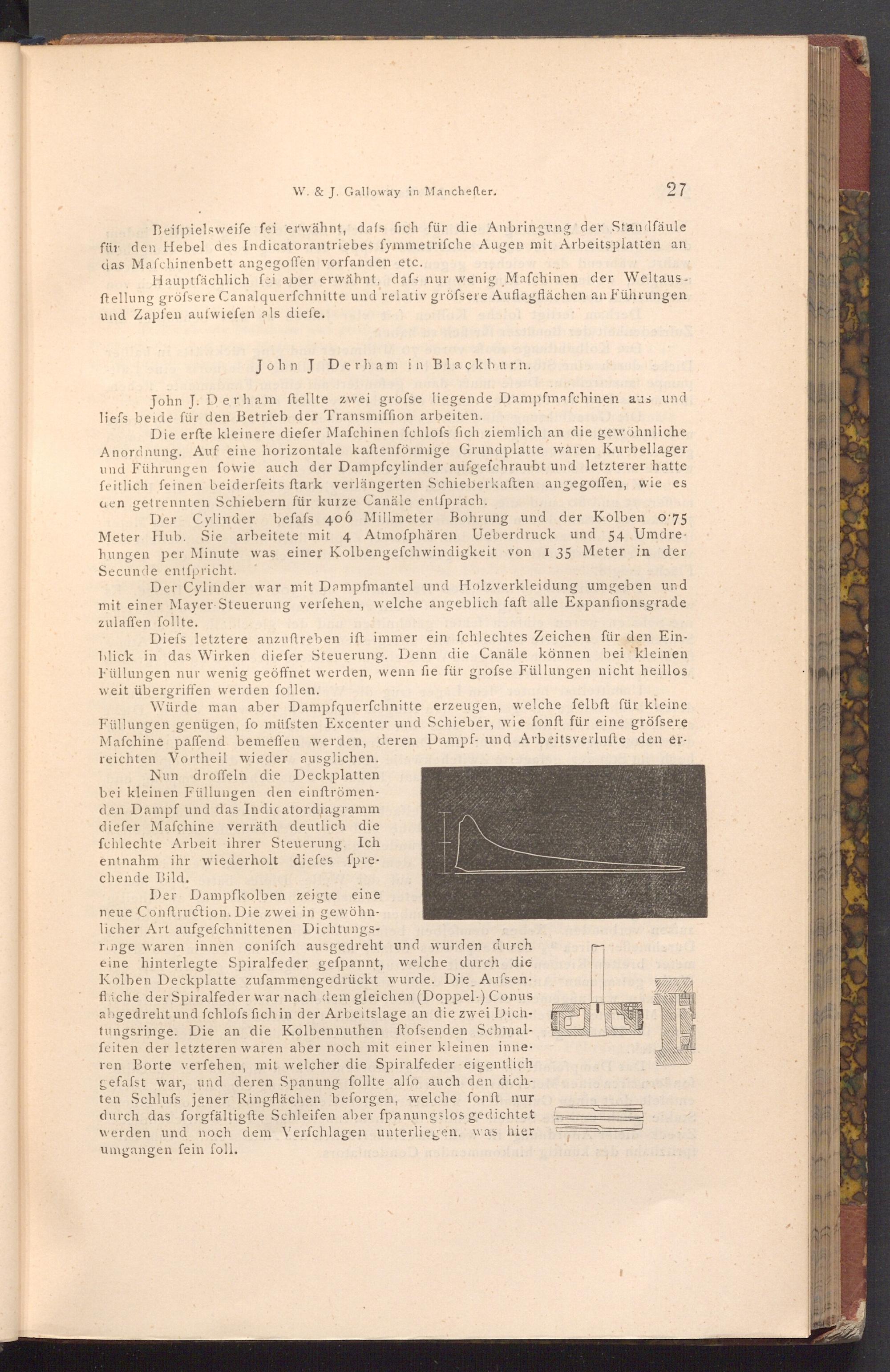 Der Cylinder befafs 406 Millmeter Bohrung und der Kolben o 75 Meter Hub. Sie arbeitete mit 4 Atmofphären Ueberdruck und 54 Umdrehungen per Minute was einer Kolbengefchwindigkeit von I 35 Meter in der Secunde entfpricht.