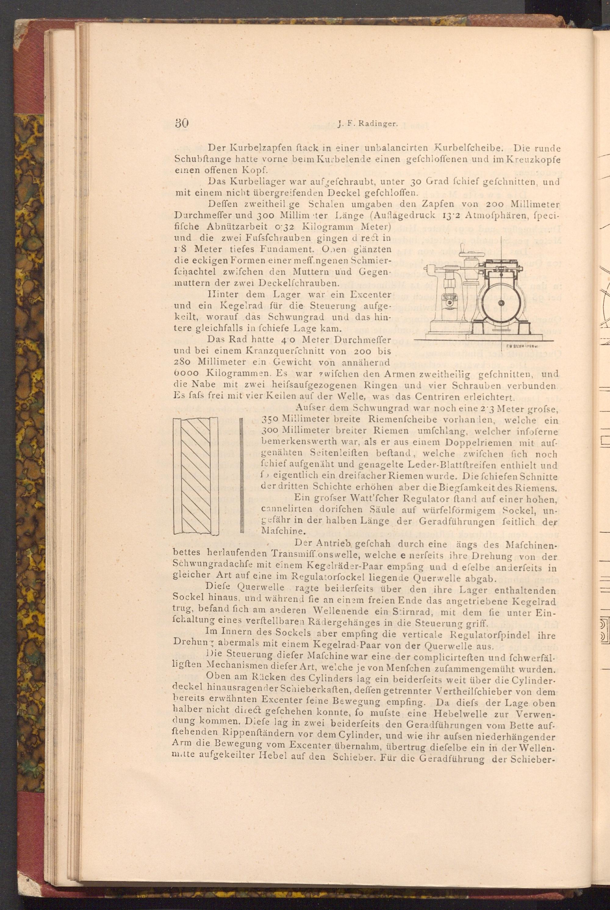 Aufser dem Schwungrad war noch eine 2: 3 Meter grofse, 350 Millimeter breite Riemenfcheibe vorhanden, welche ein 300 Millimeter breiter Riemen umfchlang, welcher infoferne bemerkenswerth war, als er aus einem Doppelriemen mit aufgenähten Seitenleiften beftand, welche zwifchen fich noch fchief aufgenäht und genagelte Leder- Blattftreifen enthielt und f eigentlich ein dreifacher Riemen wurde. Die fchiefen Schnitte der dritten Schichte erhöhen aber die Biegfamkeit des Riemens. Ein grofser Watt'fcher Regulator ftand auf einer hohen, cannelirten dorifchen Säule auf würfelförmigem Sockel, ungefähr in der halben Länge der Geradführungen feitlich der Mafchine.