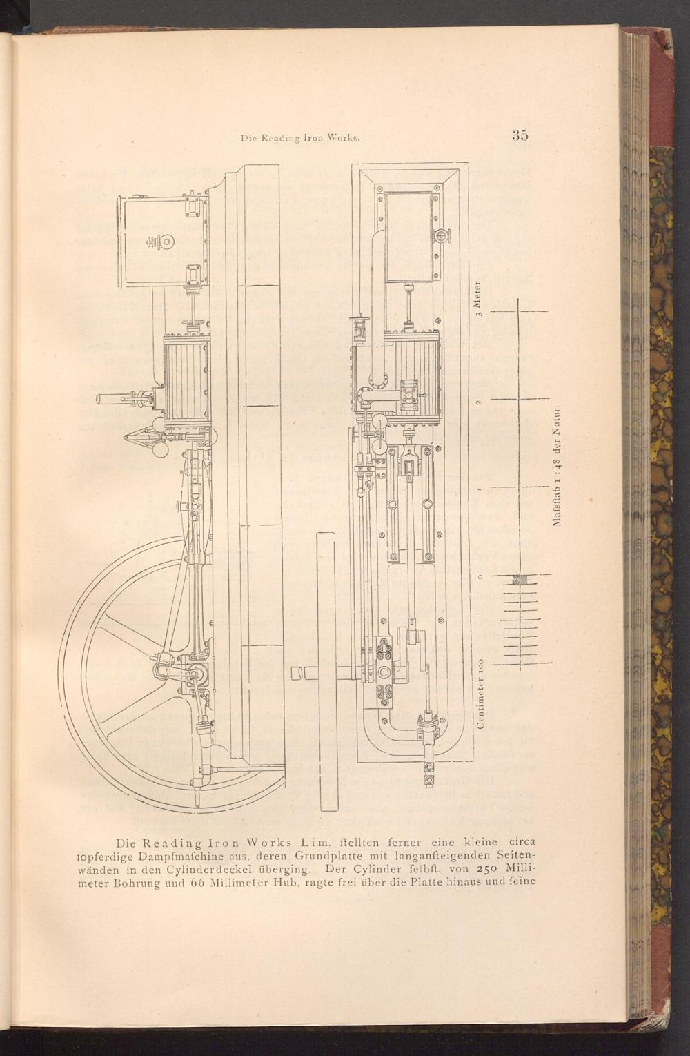 Die Reading Iron Works Lim. ftellten ferner eine kleine circa Topferdige Dampfmaschine aus, deren Grundplatte mit langanfteigenden Seitenwänden in den Cylinder deckel überging. Der Cylinder felbft, von 250 Millimeter Bohrung und 66 Millimeter Hub, ragte frei über die Platte hinaus und feine
