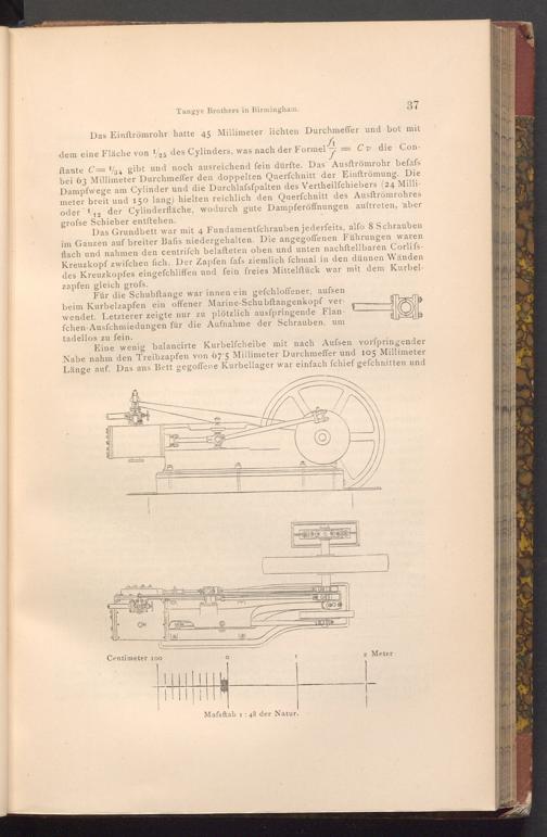 Für die Schubftange war innen ein gefchloffener, aufsen beim Kurbelzapfen ein offener Marine- Schubftangenkopf verwendet. Letzterer zeigte nur zu plötzlich ausfpringende Flanfchen- Ausfchmiedungen für die Aufnahme der Schrauben, um tadellos zu fein.
