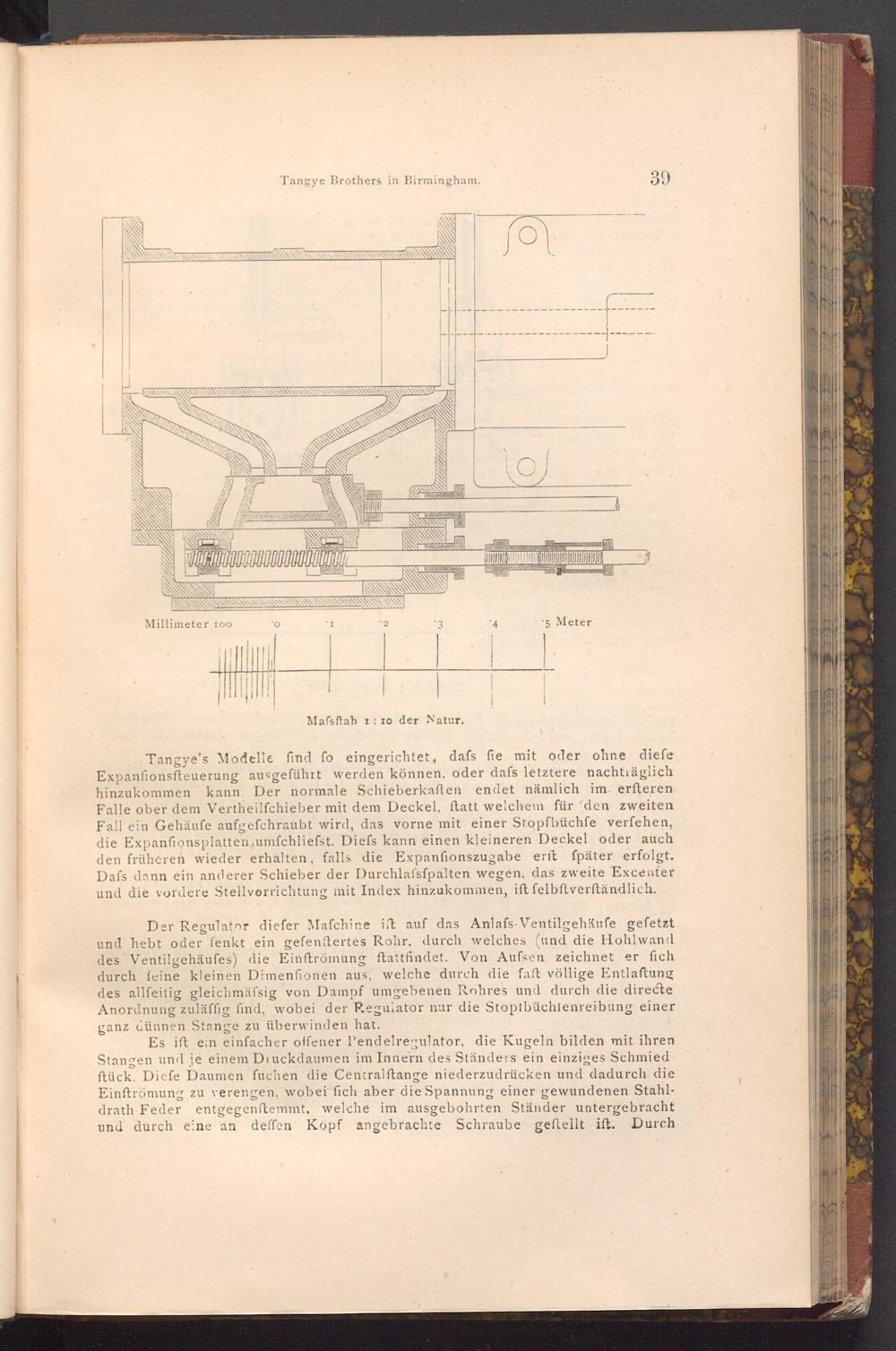 Tangye's Modelle find fo eingerichtet, dafs fie mit oder ohne diefe Expanfionsfteuerung ausgeführt werden können, oder dafs letztere nachträglich hinzukommen kann. Der normale Schieberkaften endet nämlich im erfteren. Falle ober dem Vertheilfchieber mit dem Deckel, ftatt welchem für den zweiten Fall ein Gehäufe aufgefchraubt wird, das vorne mit einer Stopfbüchfe verfehen, die Expanfionsplatten umfchliefst. Diefs kann einen kleineren Deckel oder auch den früheren wieder erhalten, falls die Expanfionszugabe erit fpäter erfolgt. Dafs dann ein anderer Schieber der Durchlafsfpalten wegen, das zweite Excenter und die vordere Stellvorrichtung mit Index hinzukommen, ift felbftverſtändlich.