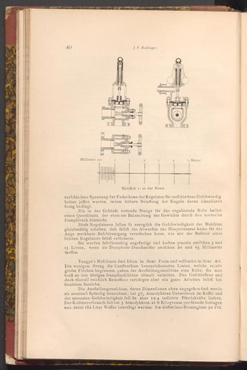 Diefe Regulatoren follen fo energifch die Gefchwindigkeit der Maſchine gleichmäfsig erhalten, dafs felbft das Abwerfen des Hauptriemens keine für das Auge merkbare Befchleunigung verurfachen kann, wie mir der Befitzer eines folchen Regulators felbft verficherte.