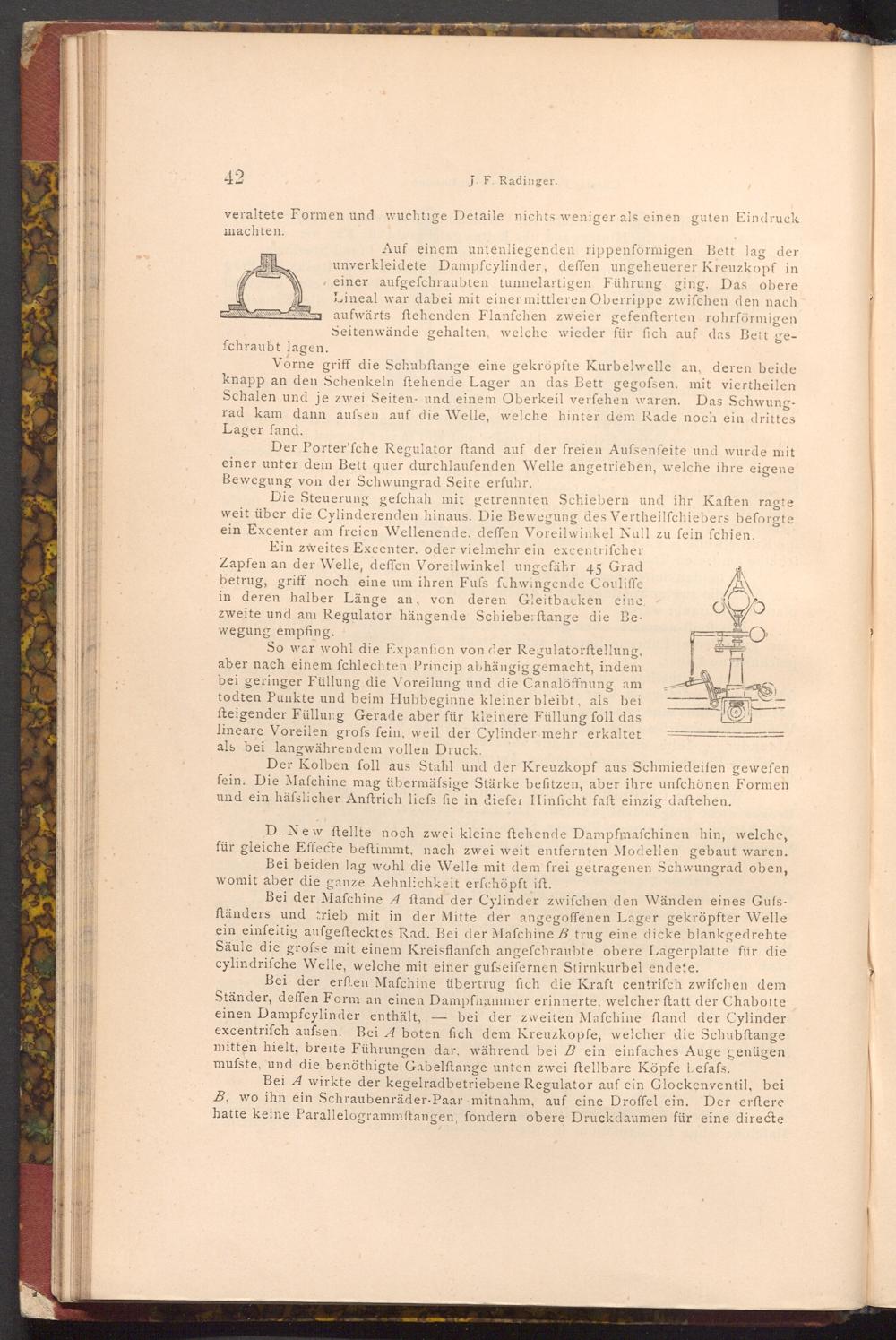 Auf einem untenliegenden rippenförmigen Bett lag der unverkleidete Dampfcylinder, deffen ungeheuerer Kreuzkopf in einer aufgefchraubten tunnelartigen Führung ging. Das obere Lineal war dabei mit einer mittleren Oberrippe zwifchen den nach aufwärts ftehenden Flanfchen zweier gefenfterten rohrförmigen Seitenwände gehalten, welche wieder für fich auf das Bett ge