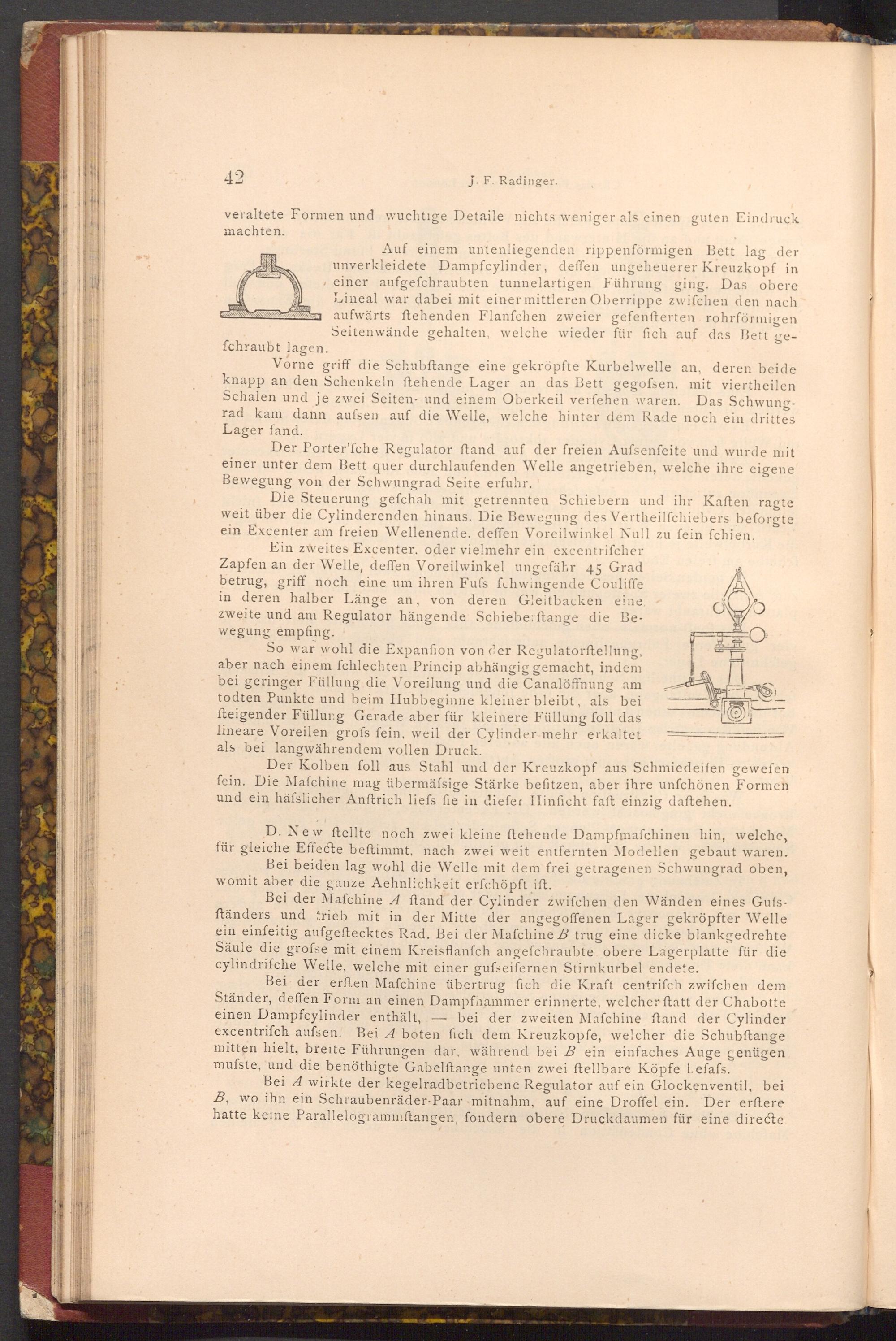 Die Steuerung gefchah mit getrennten Schiebern und ihr Kaften ragte weit über die Cylinderenden hinaus. Die Bewegung des Vertheilfchiebers beforgte ein Excenter am freien Wellenende, deffen Voreilwinkel Null zu fein fchien. Ein zweites Excenter, oder vielmehr ein excentrifcher Zapfen an der Welle, deffen Voreilwinkel ungefähr 45 Grad betrug, griff noch eine um ihren Fufs fchwingende Couliffe in deren halber Länge an, von deren Gleitbacken eine. zweite und am Regulator hängende Schiebe: ftange die Bewegung empfing.