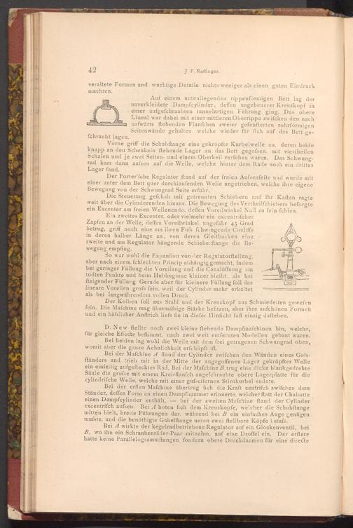 D. New ftellte noch zwei kleine ftehende Dampfmaschinen hin, welche, für gleiche Effecte beftimmt, nach zwei weit entfernten Modellen gebaut waren. Bei beiden lag wohl die Welle mit dem frei getragenen Schwungrad oben, womit aber die ganze Aehnlichkeit erfchöpft ift.