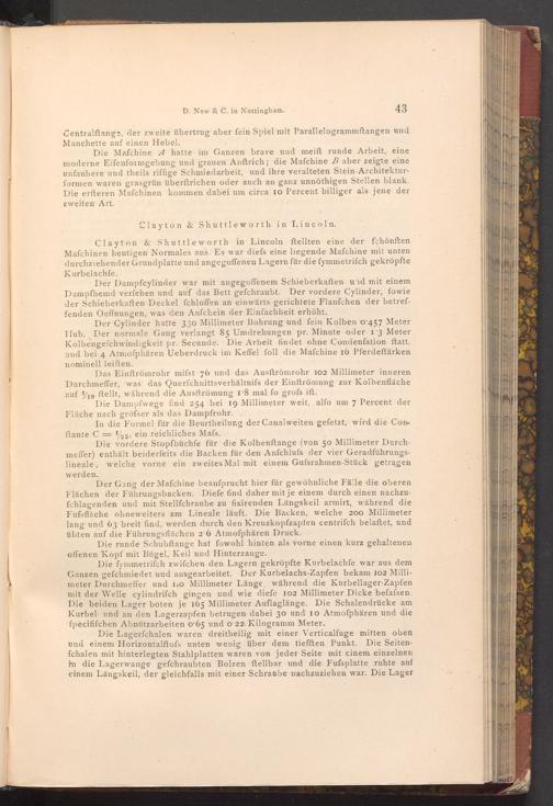 Clayton& Shuttleworth in Lincoln ftellten eine der fchönften Mafchinen heutigen Normales aus. Es war diefs eine liegende Mafchine mit unten durchziehender Grundplatte und angegoffenen Lagern für die fymmetriſch gekröpfte Kurbelachfe.