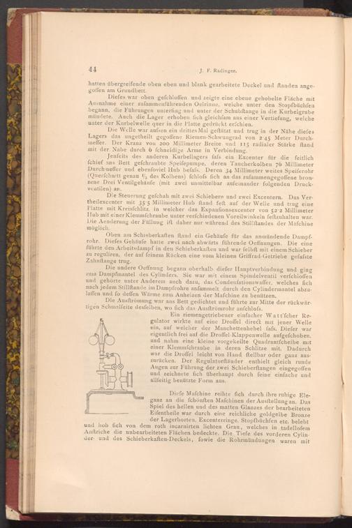Diefe Mafchine reihte fich durch ihre ruhige Eleganz an die fchönften Mafchinen der Ausftellung an. Das Spiel des hellen und des matten Glanzes der bearbeiteten Eifentheile war durch eine reichliche goldgelbe Bronze der Lagerborten, Excenterringe, Stopfbüchfen etc. belebt und hob fich von dem roth incarnirten lichten Grau, welches in tadellofem Anftriche die unbearbeiteten Flächen bedeckte. Die Tiefe des vorderen Cylinder und des Schieberkaften- Deckels, fowie die Rohrmündungen waren mit