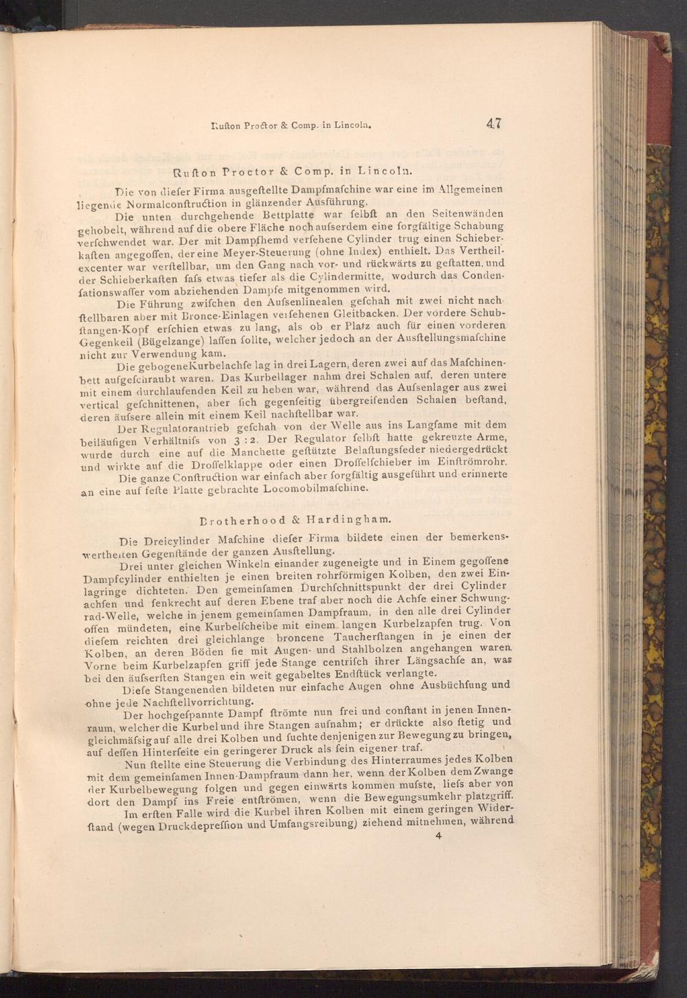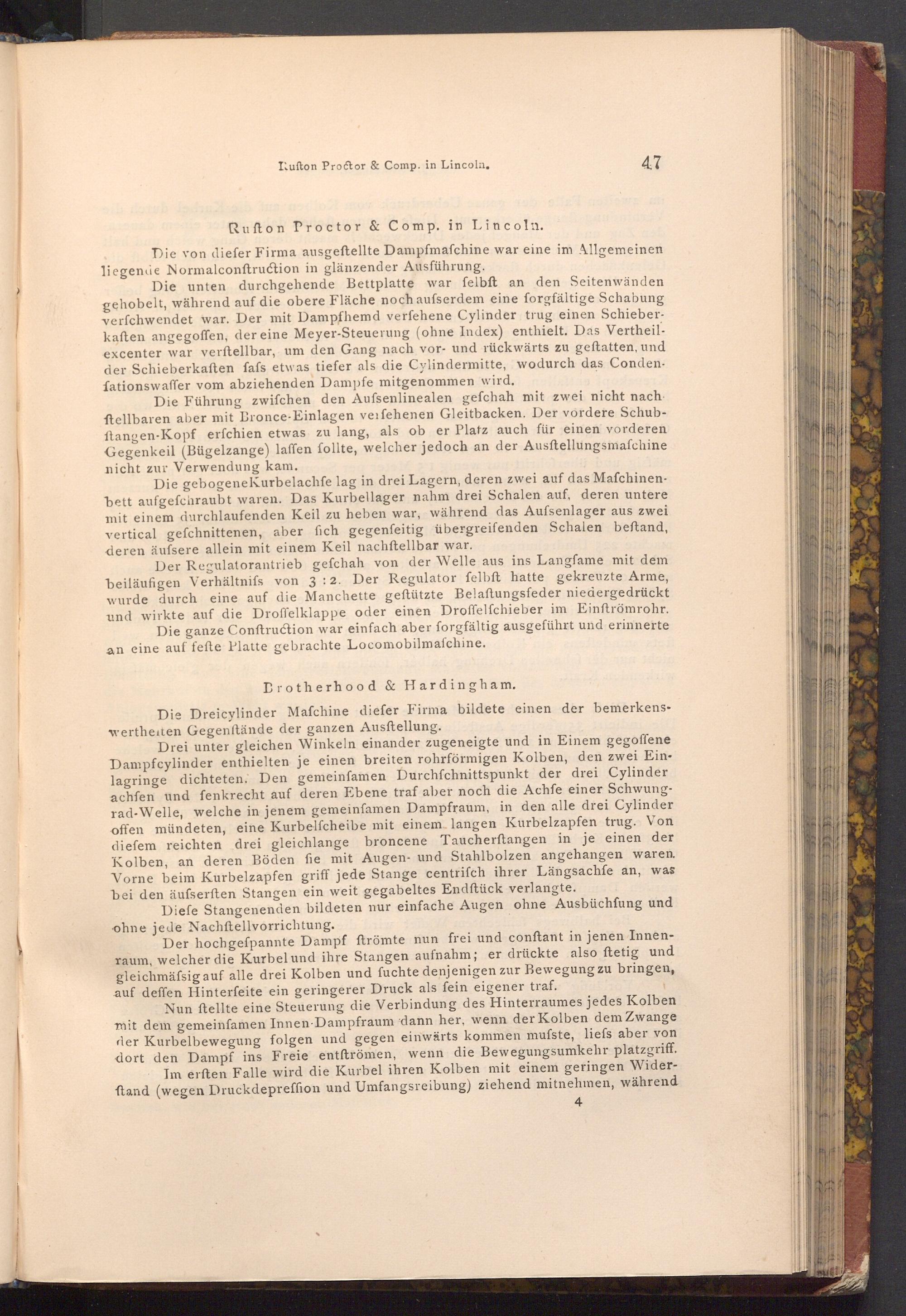 Die von diefer Firma ausgeftellte Dampfmaſchine war eine im Allgemeinen liegende Normal conftruction in glänzender Ausführung.