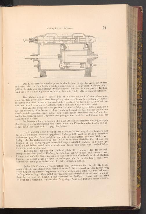 Jedenfalls ift aber die Conftruction und befonders für die directe Stofspumpe höchft beachtenswerth, denn dort mufs doch einmal mit der Einführung eines Expanfionsfyftemes begonnen werden, deffen einfachfte bis nun bekannte Löfung hier vorlag. Aber felbft für Transmiffionsbetrieb kann fie manchen Vortheil bieten und ift höchft beachtenswerth zu heifsen. Kaum gibt es eine Woolf'fche Mafchine, welche eine fo geringe Zahl von Beftandtheilen enthält.