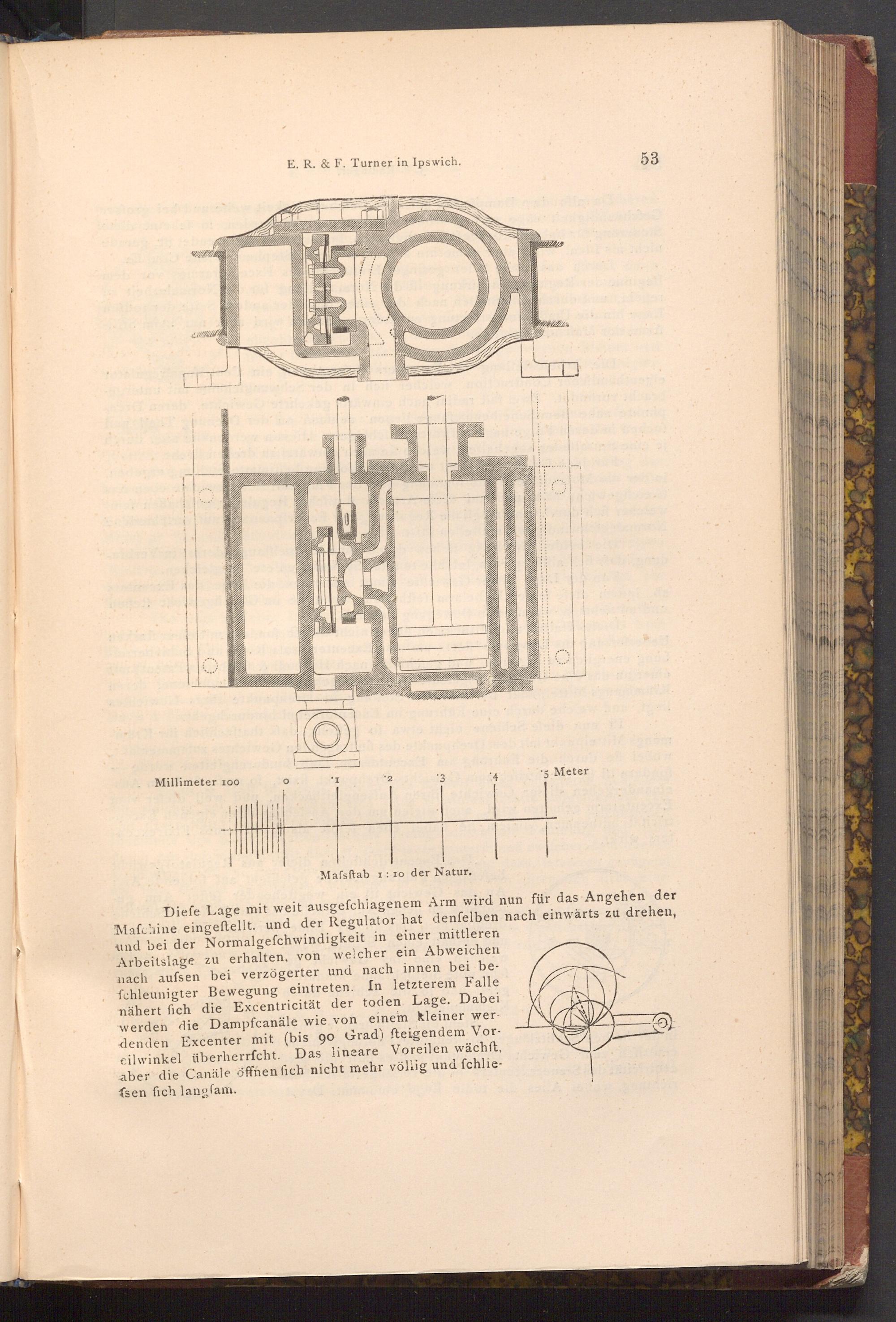 Diefe Lage mit weit ausgefchlagenem Arm wird nun für das Angehen der Mafchine eingeftellt. und der Regulator hat denfelben nach einwärts zu drehen, und bei der Normalgefchwindigkeit in einer mittleren Arbeitslage zu erhalten, von welcher ein Abweichen nach aufsen bei verzögerter und nach innen bei befchleunigter Bewegung eintreten. In letzterem Falle nähert fich die Excentricität der toden Lage. Dabei werden die Dampfcanäle wie von einem kleiner werdenden Excenter mit( bis 90 Grad) fteigendem Voreilwinkel überherrfcht. Das lineare Voreilen wächft. aber die Canäle öffnen fich nicht mehr völlig und fchliefsen fich langfam.