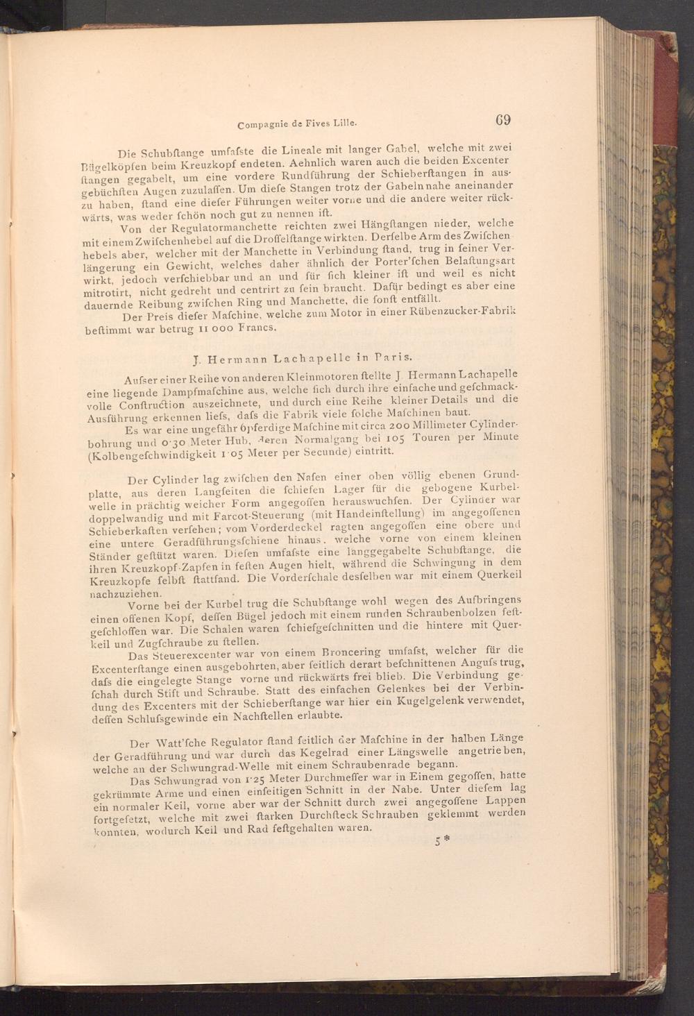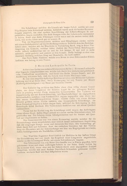 Aufser einer Reihe von anderen Kleinmotoren ftellte J. Hermann Lachapelle eine liegende Dampfmafchine aus, welche fich durch ihre einfache und gefchmackvolle Conftruction auszeichnete, und durch eine Reihe kleiner Details und die Ausführung erkennen liefs, dafs die Fabrik viele folche Mafchinen baut.