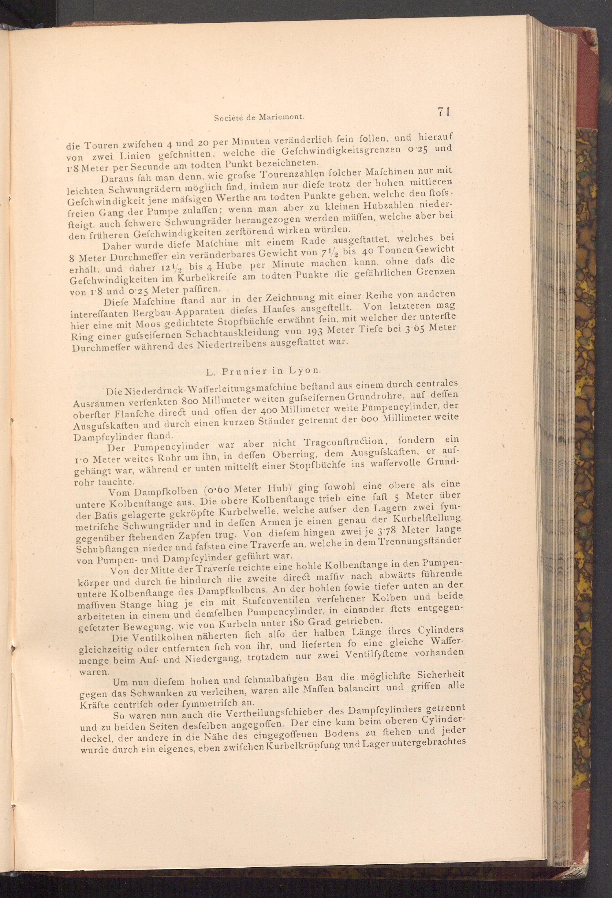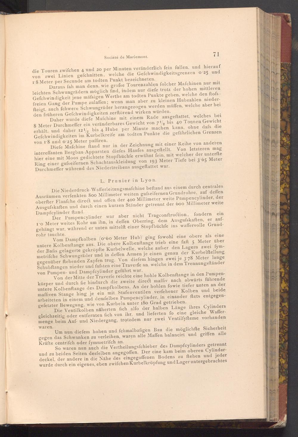 Daher wurde diefe Mafchine mit einem Rade ausgeftattet, welches bei 8 Meter Durchmeffer ein veränderbares Gewicht von 71 bis 40 Tonnen Gewicht erhält, und daher 1212 bis 4 Hube per Minute machen kann, ohne dafs die Gefchwindigkeiten im Kurbelkreife am todten Punkte die gefährlichen Grenzen von 18 und o 25 Meter paffiren.