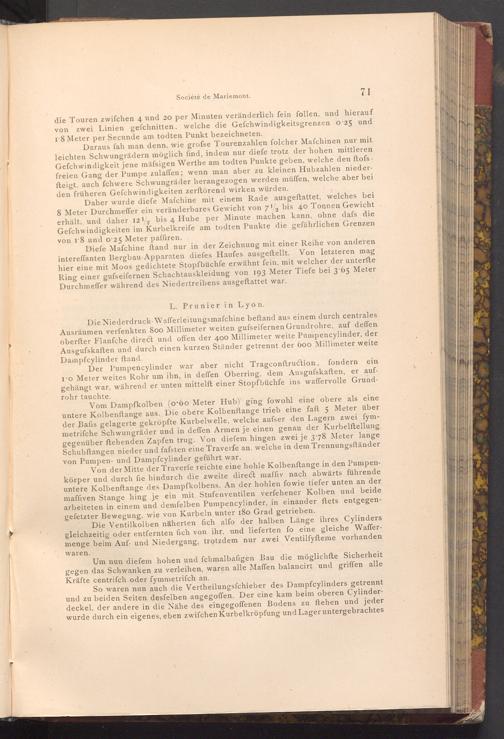 Diefe Mafchine ftand nur in der Zeichnung mit einer Reihe von anderen intereffanten Bergbau Apparaten diefes Haufes ausgeftellt. Von letzteren mag hier eine mit Moos gedichtete Stopfbüchfe erwähnt fein, mit welcher der unterfte Ring einer gufseifernen Schachtauskleidung von 193 Meter Tiefe bei 3.65 Meter Durchmeffer während des Niedertreibens ausgeftattet war.