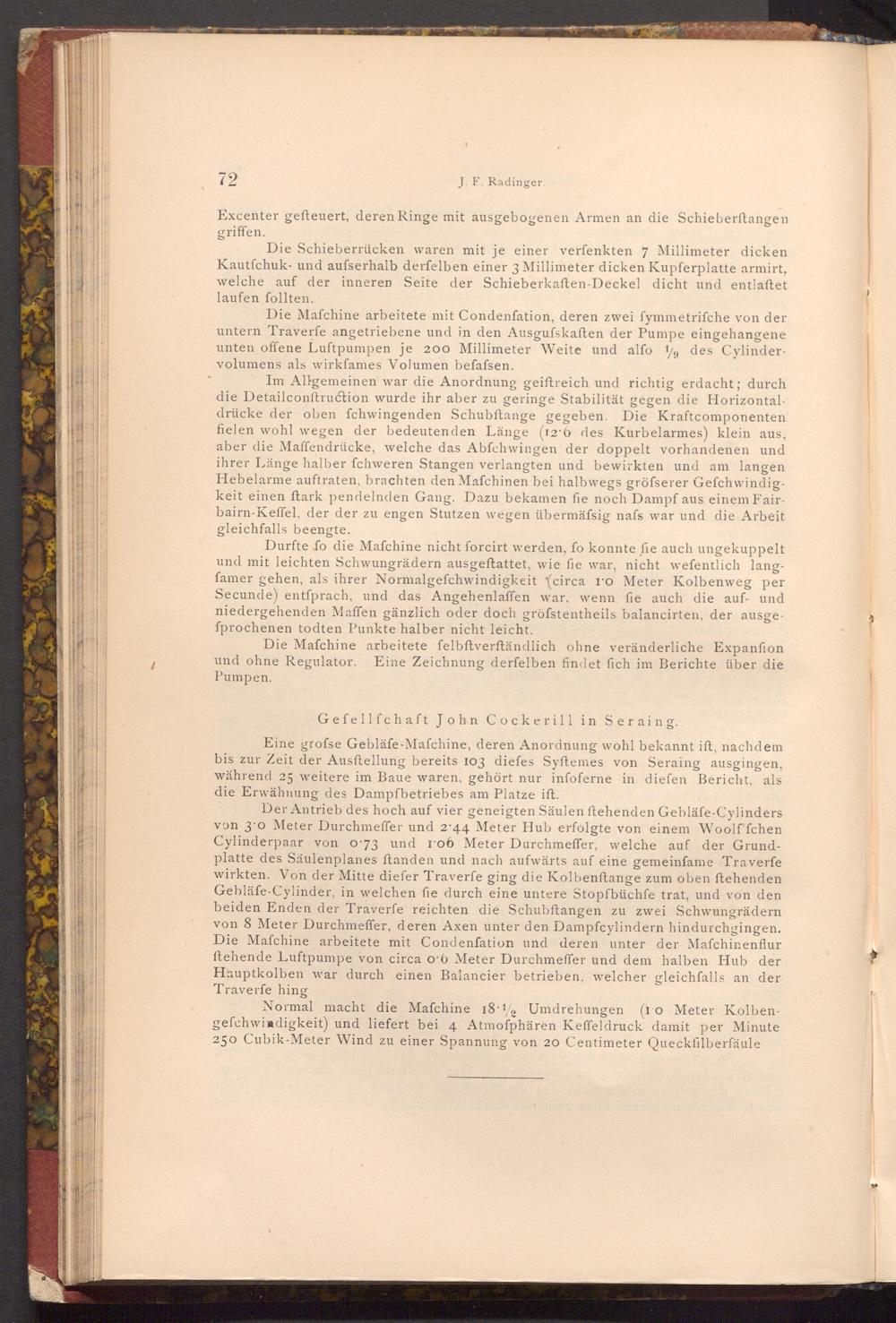 Eine grofse Gebläfe- Mafchine, deren Anordnung wohl bekannt ift, nachdem bis zur Zeit der Ausftellung bereits 103 diefes Syftemes von Seraing ausgingen, während 25 weitere im Baue waren, gehört nur infoferne in diefen Bericht, als die Erwähnung des Dampfbetriebes am Platze ift.