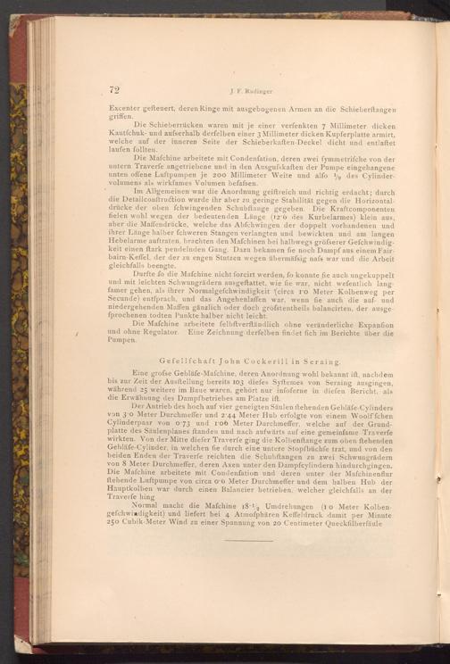 Normal macht die Mafchine 18. Umdrehungen( 10 Meter Kolbengefchwindigkeit) und liefert bei 4 Atmoſphären Keffeldruck damit per Minute 250 Cubik- Meter Wind zu einer Spannung von 20 Centimeter Queckfilberfäule