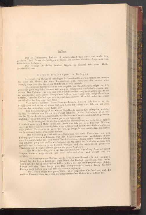 De Morfier& Mengotti in Bologna ftellten drei Dampfmaschinen aus, wovon die eine ein Motor für eine Transmifion war, während die zweite eine Dampfpampe und die dritte ein Windwerk direct betrieb.