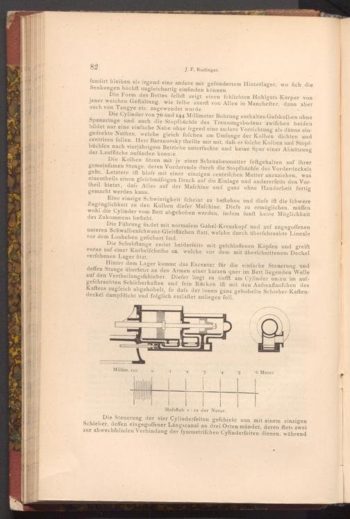 Die Cylinder von 76 und 144 Millimeter Bohrung enthalten Gufskolben ohne Spannringe und auch die Stopfbüchfe des Trennungsbodens zwifchen beiden bildet nur eine einfache Nabe ohne irgend eine andere Vorrichtung als dünne eingedrehte Nuthen, welche gleich folchen am Umfange der Kolben dichten und centriren follen. Herr Baranovsky theilte mir mit, dafs er folche Kolben und Stopfbüchfen nach vierjährigem Betriebe unterfuchte und keine Spur einer Abnützung der Lauffläche auffinden konnte.
