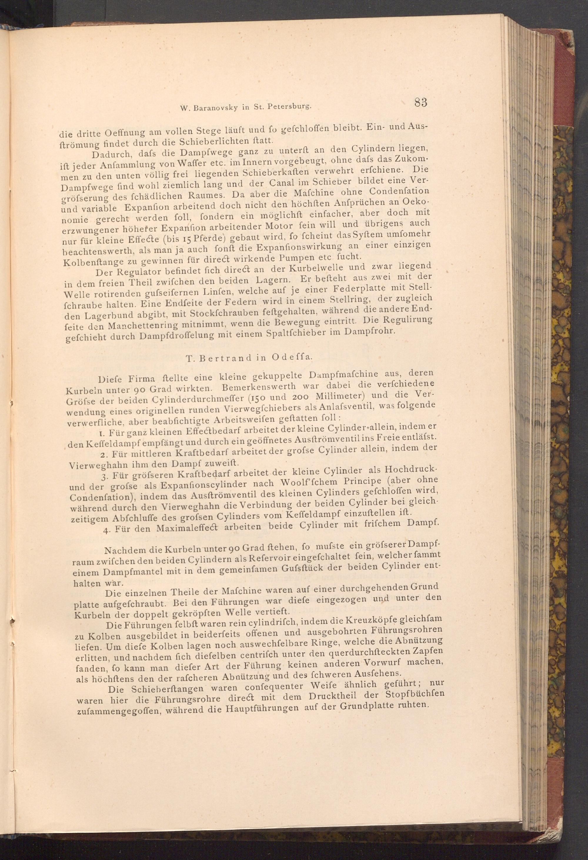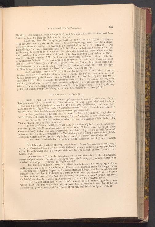 Diefe Firma ftellte eine kleine gekuppelte Dampfmafchine aus, deren Kurbeln unter 90 Grad wirkten. Bemerkenswerth war dabei die verfchiedene Gröfse der beiden Cylinderdurchmeffer( 150 und 200 Millimeter) und die Verwendung eines originellen runden Vierwegfchiebers als Anlassventil, was folgende verwerfliche, aber beabfichtigte Arbeitsweifen geftatten foll: