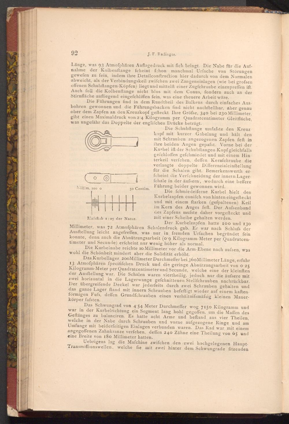 Mafsftab 1:25 der Natur. Der Kurbelzapfen hatte 100 und 130 Millimeter, was 72 Atmofphären Schalendruck gab. Er war nach Schlufs der Ausftellung leicht angefreffen, was nur in fremden Urfachen begründet fein konnte, denn auch die Abnützungsarbeit( o'9 Kilogramm- Meter per Quadratcentimeter und Secunde) erfcheint nur wenig höher als normal.