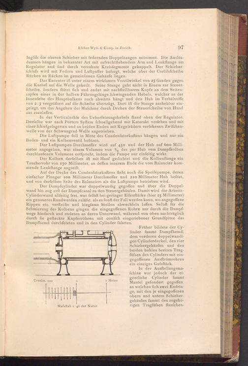 Der Luftpumpen- Durchmeffer wird auf 450 und der Hub auf 600 Millimeter angegeben, was einem Volumen von 1/8 des per Hub vom Dampfkolben durchlaufenen Volumens entſpricht, indem die Pumpe nur einfeitig wirkt.