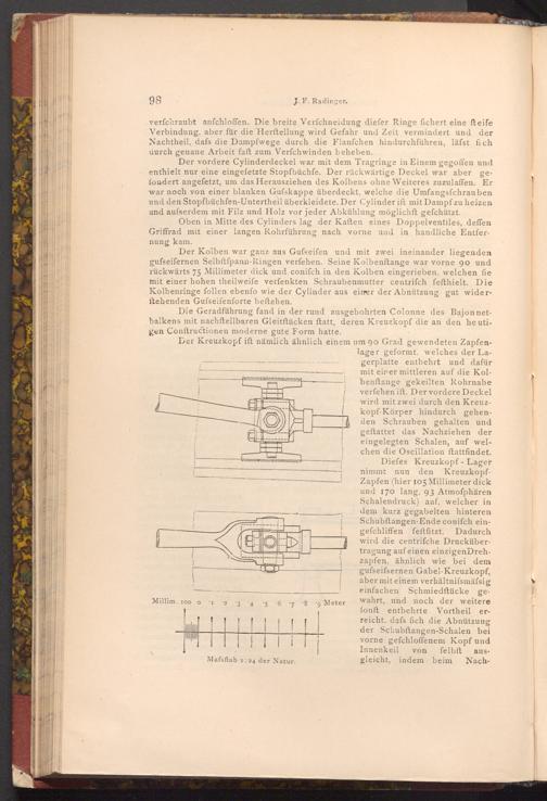 Diefes Kreuzkopf- Lager nimmt nun den KreuzkopfZapfen( hier 105 Millimeter dick und 170 lang, 93 Atmoſphären Schalendruck) auf, welcher in dem kurz gegabelten hinteren Schubftangen- Ende conifch eingefchliffen feſtfitzt. Dadurch wird die centrifche Druckübertragung auf einen einzigen Drehzapfen, ähnlich wie bei dem gufseifsernen Gabel- Kreuzkopf, aber mit einem verhältnifsmäfsig einfachen Schmiedftücke gewahrt, und noch der weitere fonft entbehrte Vortheil erreicht, dafs fich die Abnützung der Schubftangen- Schalen bei vorne gefchloffenem Kopf und Innenkeil von felbft ausgleicht, indem beim Nach