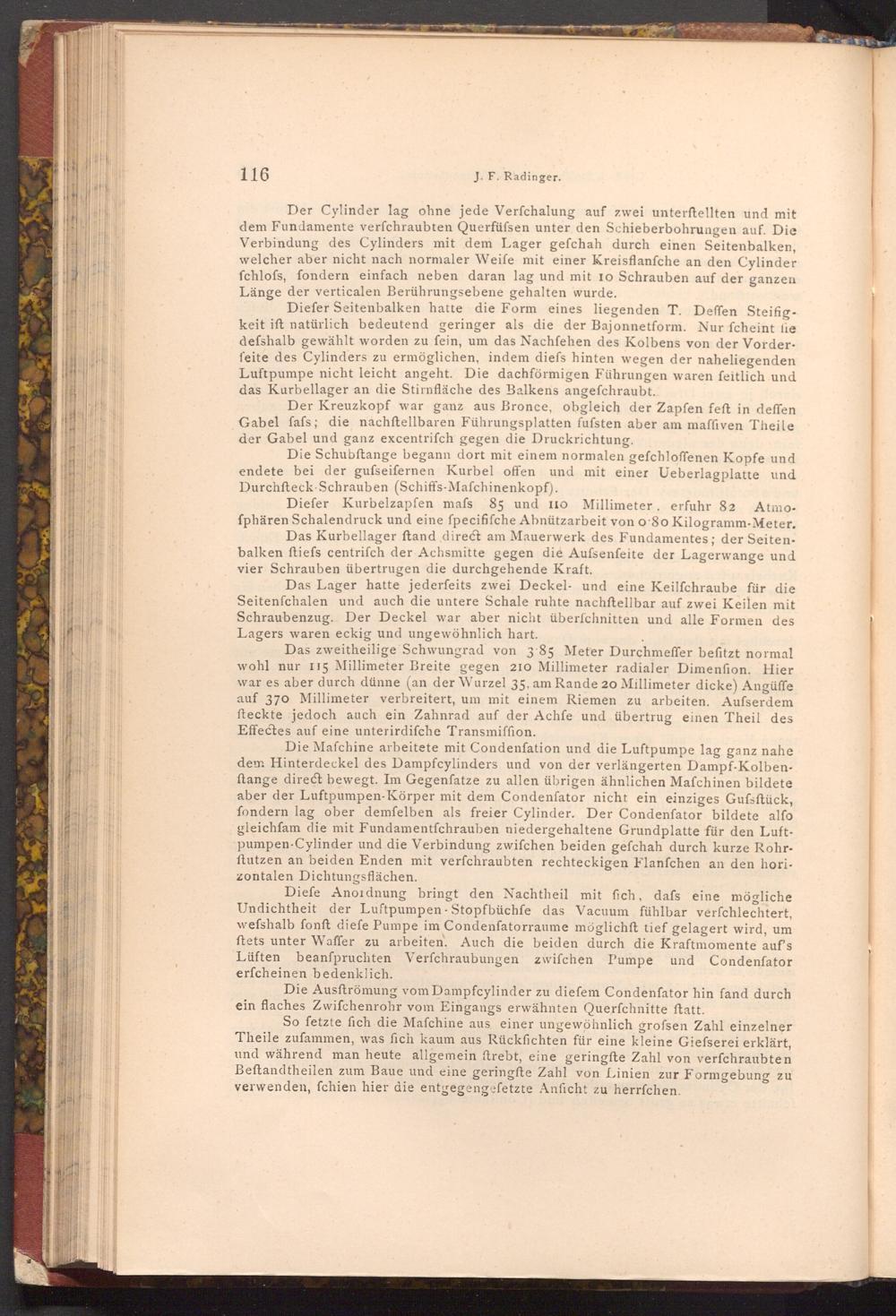 Die Mafchine arbeitete mit Condenfation und die Luftpumpe lag ganz nahe dem Hinterdeckel des Dampfcylinders und von der verlängerten Dampf- Kolbenftange direct bewegt. Im Gegenfatze zu allen übrigen ähnlichen Mafchinen bildete aber der Luftpumpen- Körper mit dem Condenſator nicht ein einziges Gufsftück, fondern lag ober demfelben als freier Cylinder. Der Condenfator bildete alfo gleichfam die mit Fundamentfchrauben niedergehaltene Grundplatte für den Luftpumpen Cylinder und die Verbindung zwifchen beiden gefchah durch kurze Rohrftutzen an beiden Enden mit verfchraubten rechteckigen Flanfchen an den horizontalen Dichtungsflächen.
