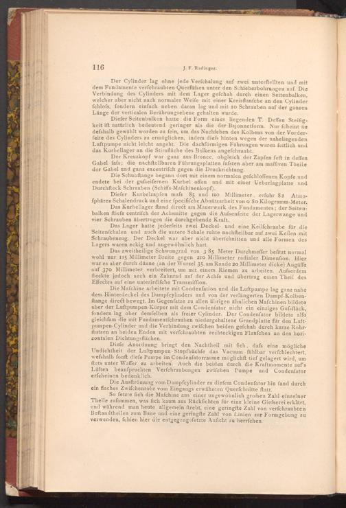 Diefer Seitenbalken hatte die Form eines liegenden T. Deffen Steifigkeit ist natürlich bedeutend geringer als die der Bajonnetform. Nur ſcheint fie defshalb gewählt worden zu fein, um das Nachfehen des Kolbens von der Vorderfeite des Cylinders zu ermöglichen, indem diefs hinten wegen der naheliegenden Luftpumpe nicht leicht angeht. Die dachförmigen Führungen waren feitlich und das Kurbellager an die Stirnfläche des Balkens angefchraubt.