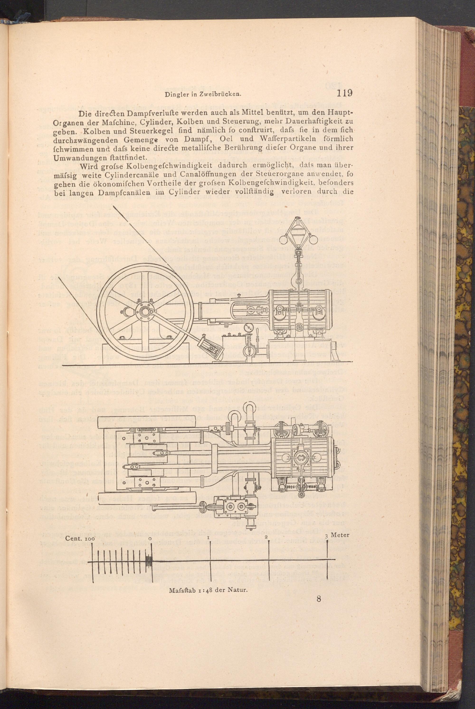 Die directen Dampfverlufte werden auch als Mittel benützt, um den HauptOrganen der Mafchine, Cylinder, Kolben und Steuerung, mehr Dauerhaftigkeit zu geben. Kolben und Steuerkegel find nämlich fo conftruirt, dafs fie in dem fich durchzwängenden Gemenge von Dampf, Oel und Wafferpartikeln förmlich fchwimmen und dafs keine directe metallifche Berührung diefer Organe und ihrer Umwandungen ftattfindet.