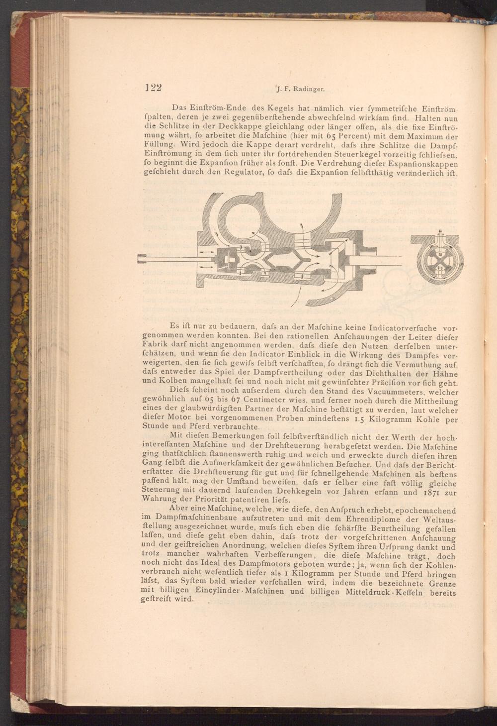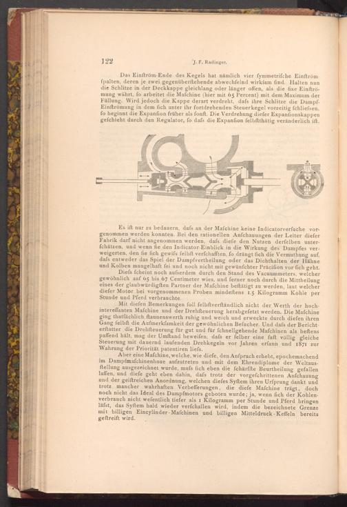 Aber eine Mafchine, welche, wie diefe, den Anfpruch erhebt, epochemachend im Dampfmafchinenbaue aufzutreten und mit dem Ehrendiplome der Weltausftellung ausgezeichnet wurde, mufs fich eben die fchärffte Beurtheilung gefallen laffen, und diefe geht eben dahin, dafs trotz der vorgefchrittenen Anfchauung und der geistreichen Anordnung, welchen diefes Syftem ihren Urfprung dankt und trotz mancher wahrhaften Verbefferungen, die diefe Mafchine trägt, doch noch nicht das Ideal des Dampfmotors geboten wurde; ja, wenn fich der Kohlenverbrauch nicht wefentlich tiefer als I Kilogramm per Stunde und Pferd bringen läfst, das Syftem bald wieder verfchallen wird, indem die bezeichnete Grenze mit billigen Eincylinder Maſchinen und billigen Mitteldruck Keffeln bereits geftreift wird.