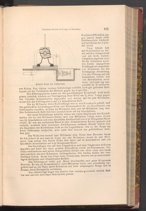 Die 63 Millimeter dicke Kolbenstange war in den Kreuzkopfe gekeilt und das gefchloffene Schubftangen- Ende( mit Horizontalkeil für die Innenfchale) vom Gabelzapfen ergriffen, welcher 70 Millimeter dick und 110 Millimeter lang war. Der Schalendruck ftellt fich hier ziemlich hoch auf 114 Atmofphären.