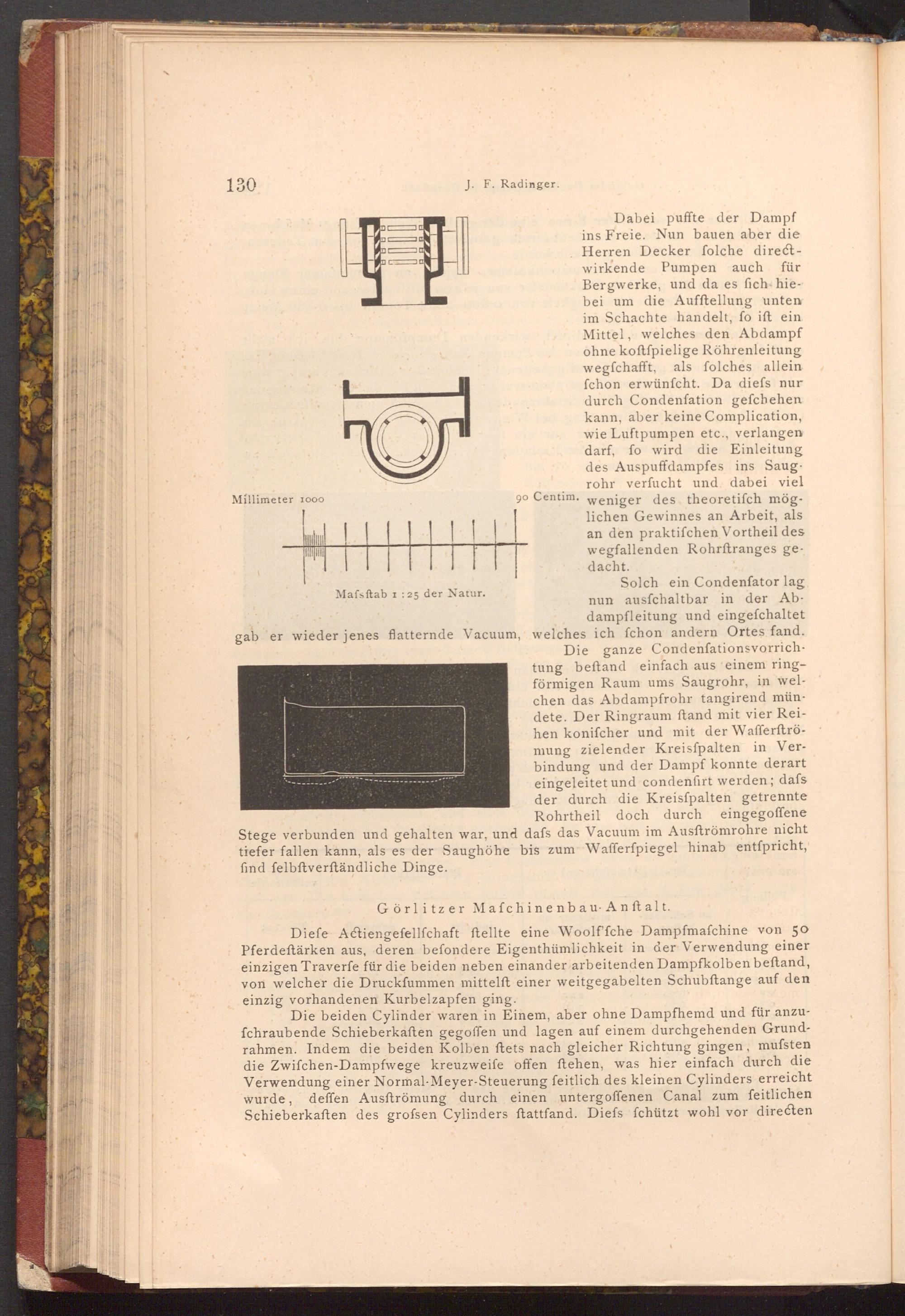 Die ganze Condenfationsvorrichtung beftand einfach aus einem ringförmigen Raum ums Saugrohr, in welchen das Abdampfrohr tangirend mündete. Der Ringraum ftand mit vier Reihen konifcher und mit der Wafferftrömung zielender Kreisfpalten in Verbindung und der Dampf konnte derart eingeleitet und condenfirt werden; dafs der durch die Kreisfpalten getrennte Rohrtheil doch durch eingegoffene Stege verbunden und gehalten war, und dafs das Vacuum im Ausftrömrohre nicht tiefer fallen kann, als es der Saughöhe bis zum Wafferfpiegel hinab entſpricht, find felbftverſtändliche Dinge.