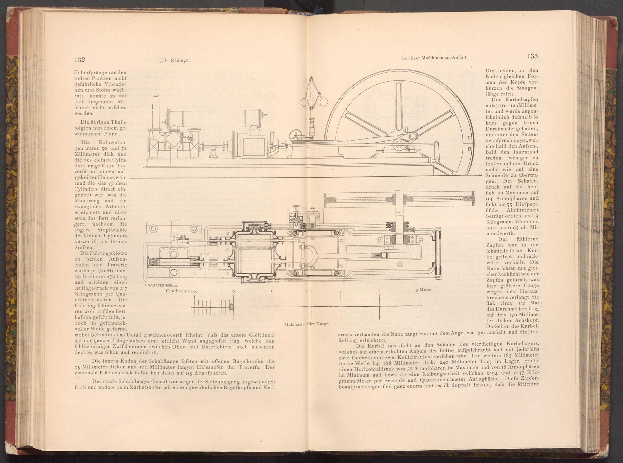 Die Kurbel fafs dicht an den Schalen des viertheiligen Kurbellagers, welches auf einem erhöhten Angufs des Bettes aufgefchraubt und mit jederfeits zwei Deckeln und zwei Keilfchrauben verfehen war. Die weiters 185 Millimeter ftarke Welle lag 168 Millimeter dick, 240 Millimeter lang im Lager, erfuhr einen Horizontaldruck von 37 Atmoſphären im Maximum und von 18 Atmoſphären im Minimum und bewirkte eine Reibungsarbeit zwifchen o 94 und 0.47 Kilogramm- Meter per Secunde und Quadratcentimeter Auflagfläche. Diefe Zapfenbeanfpruchungen find ganz enorm und es ift doppelt fchade, dafs die Mafchine