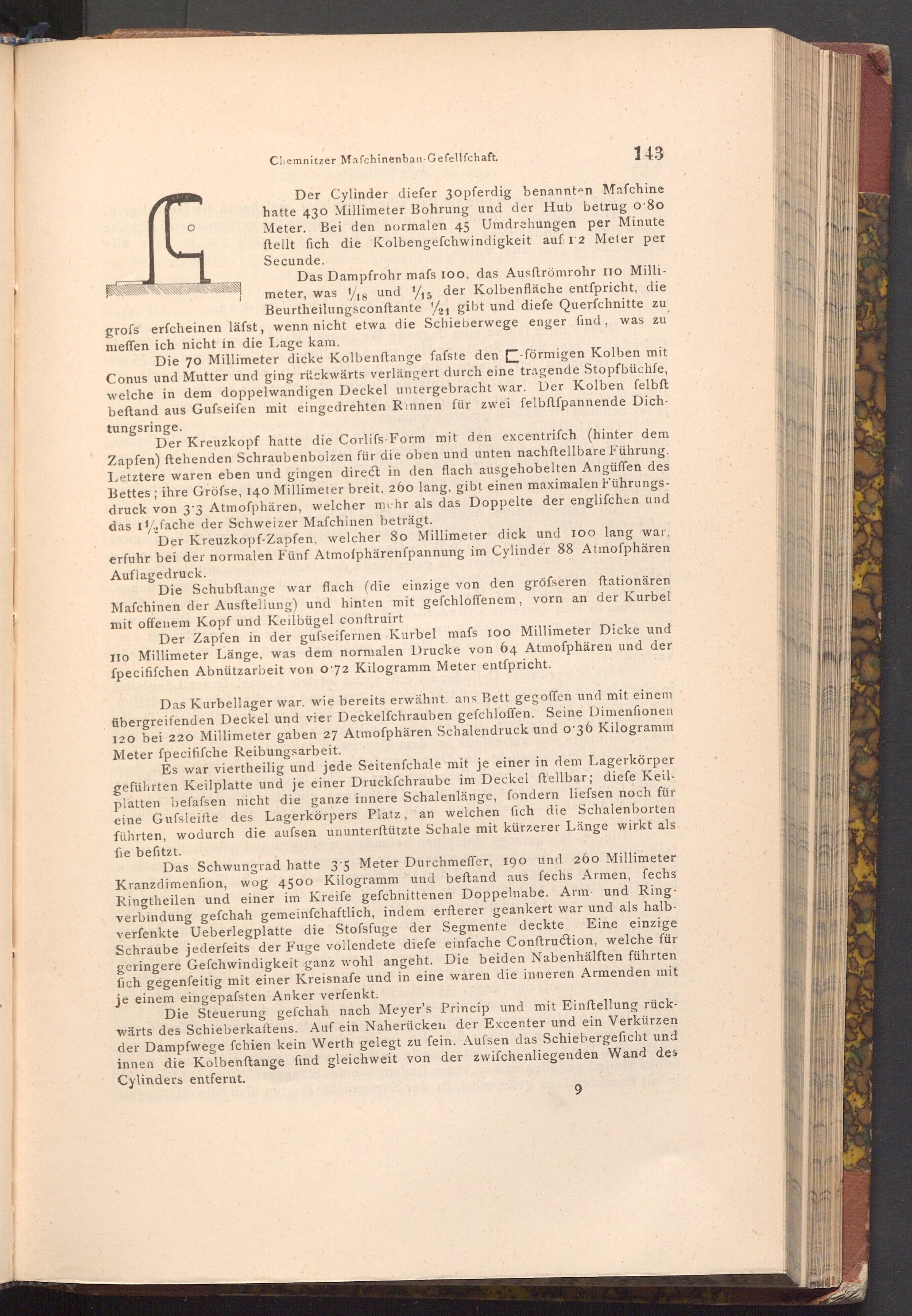 Der Cylinder diefer 30pferdig benannten Mafchine hatte 430 Millimeter Bohrung und der Hub betrug o 80 Meter. Bei den normalen 45 Umdrehungen per Minute ftellt fich die Kolbengefchwindigkeit auf 12 Meter per Secunde.