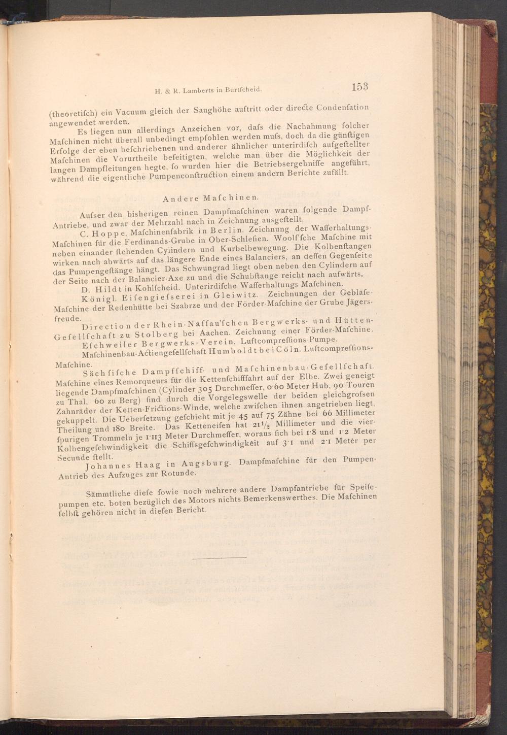 C. Hoppe, Mafchinenfabrik in Berlin. Zeichnung der WafferhaltungsMafchinen für die Ferdinands- Grube in Ober- Schlefien. Woolf'fche Mafchine mit neben einander ftehenden Cylindern und Kurbelbewegung. Die Kolbenftangen wirken nach abwärts auf das längere Ende eines Balanciers, an deffen Gegenfeite das Pumpengeftänge hängt. Das Schwungrad liegt oben neben den Cylindern auf der Seite nach der Balancier- Axe zu und die Schubftange reicht nach aufwärts. D. Hildt in Kohlfcheid. Unterirdifche Wafferhaltungs Mafchinen. Königl. Eifengiefserei in Gleiwitz. Zeichnungen der GebläfeMafchine der Redenhütte bei Szabrze und der Förder Mafchine der Grube Jägersfreude.