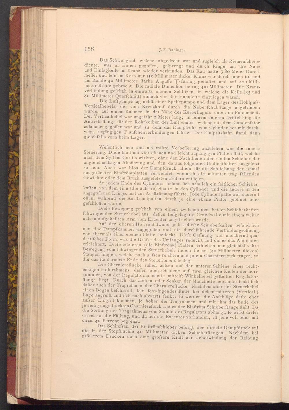 Die Charniereftücke ruhen aufsen auf der unteren Schiene eines rechteckigen Hohlrahmens, deffen obere Schiene auf zwei gleichen Keilen der horizontalen, von der Regulatormanchette mittelft Winkelhebel geftellten Regulatorftange liegt. Durch das Heben oder Senken der Manchette hebt oder fenkt fich daher auch der Tragrahmen der Charniereftücke. Nachdem aber der Steuerhebel einen Bogen befchreibt, fein fchwingendes Ende bei deffen mitteren( Vertical) Lage angreift und fich nach abwärts fenkt: fo werden die Anfchläge defto eher aufser Eingriff kommen, je höher der Tragrahmen und mit ihm das Ende des jeweilig angedrückten Charniereftück Endes der Einftröm Schieberftange fteht. Da die Stellung des Tragrahmens vom Stande des Regulators abhängt, fo wirkt diefer direct auf die Füllung, und da nur ein Excenter vorhanden, ift jene voll oder mit circa 40 Percent begrenzt.