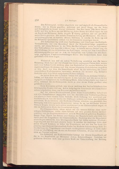 Wefentlich neu und als wahre Verbefferung anzufehen war die innere Steuerung. Diefe fand mit vier ebenen und leicht zugängigen Platten ftatt, welche nach dem Syftem Corlifs wirkten, ohne den Nachtheilen der runden Schieber, der ungleichmässigen Abnützung und den daraus folgenden Undichtheiten ausgefetzt zu fein. Auch war blos der Dampfdruck allein für die Schliefsung der einmal ausgerückten Einftrömplatten verwendet, wodurch die mitunter träg fallenden Gewichte oder dem Bruch ausgefetzten Federn entfielen.