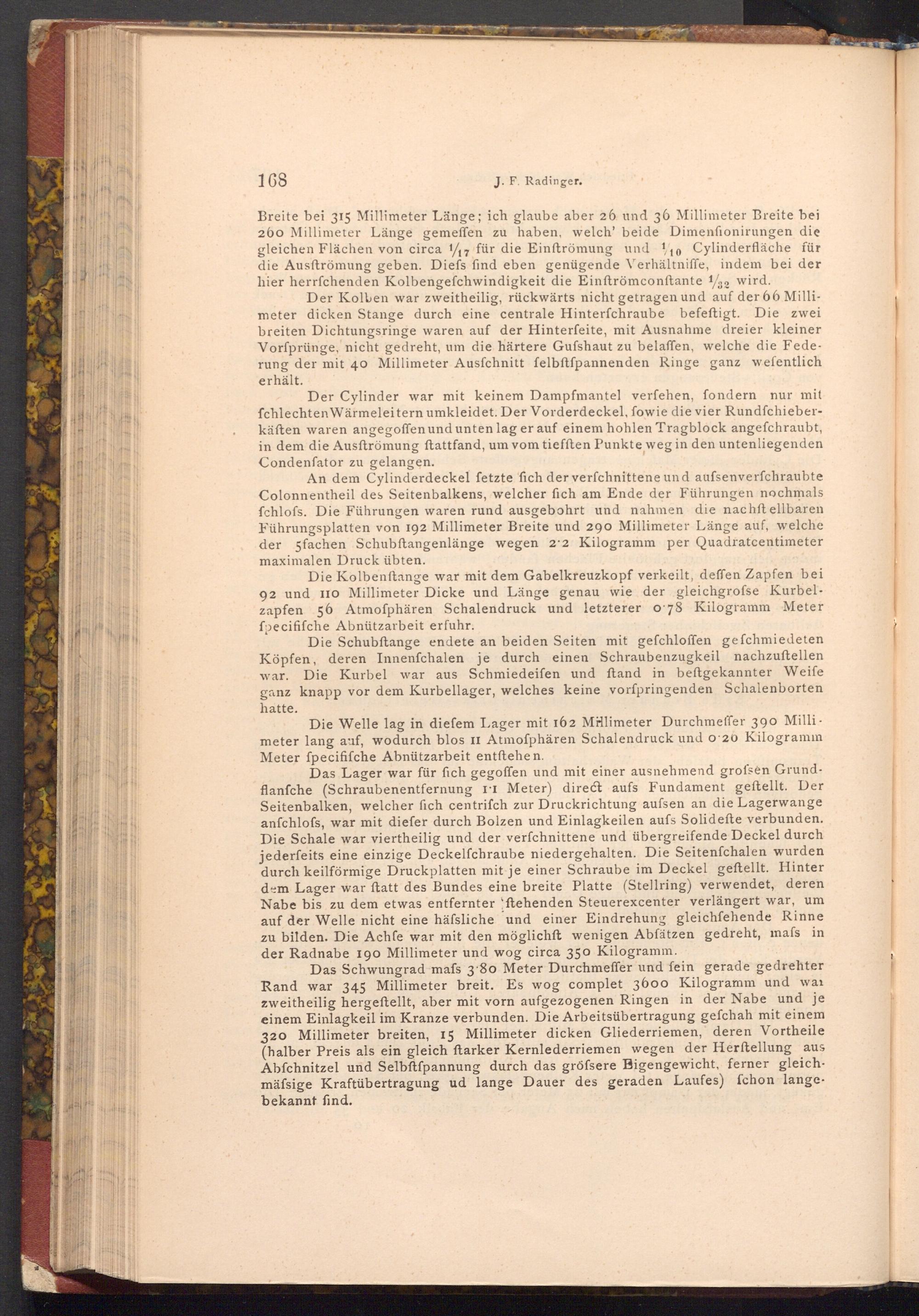 Die Kolbenstange war mit dem Gabelkreuzkopf verkeilt, deffen Zapfen bei 92 und 110 Millimeter Dicke und Länge genau wie der gleichgrofse Kurbelzapfen 56 Atmoſphären Schalendruck und letzterer o 78 Kilogramm Meter fpecififche Abnützarbeit erfuhr.