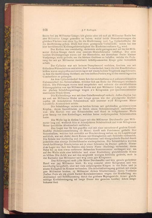 Der Cylinder war mit keinem Dampfmantel verfehen, fondern nur mit fchlechten Wärmeleitern umkleidet. Der Vorderdeckel, fowie die vier Rundfchieberkäften waren angegoffen und unten lag er auf einem hohlen Tragblock angefchraubt, in dem die Ausftrömung ftattfand, um vom tiefften Punkte weg in den untenliegenden Condenfator zu gelangen.