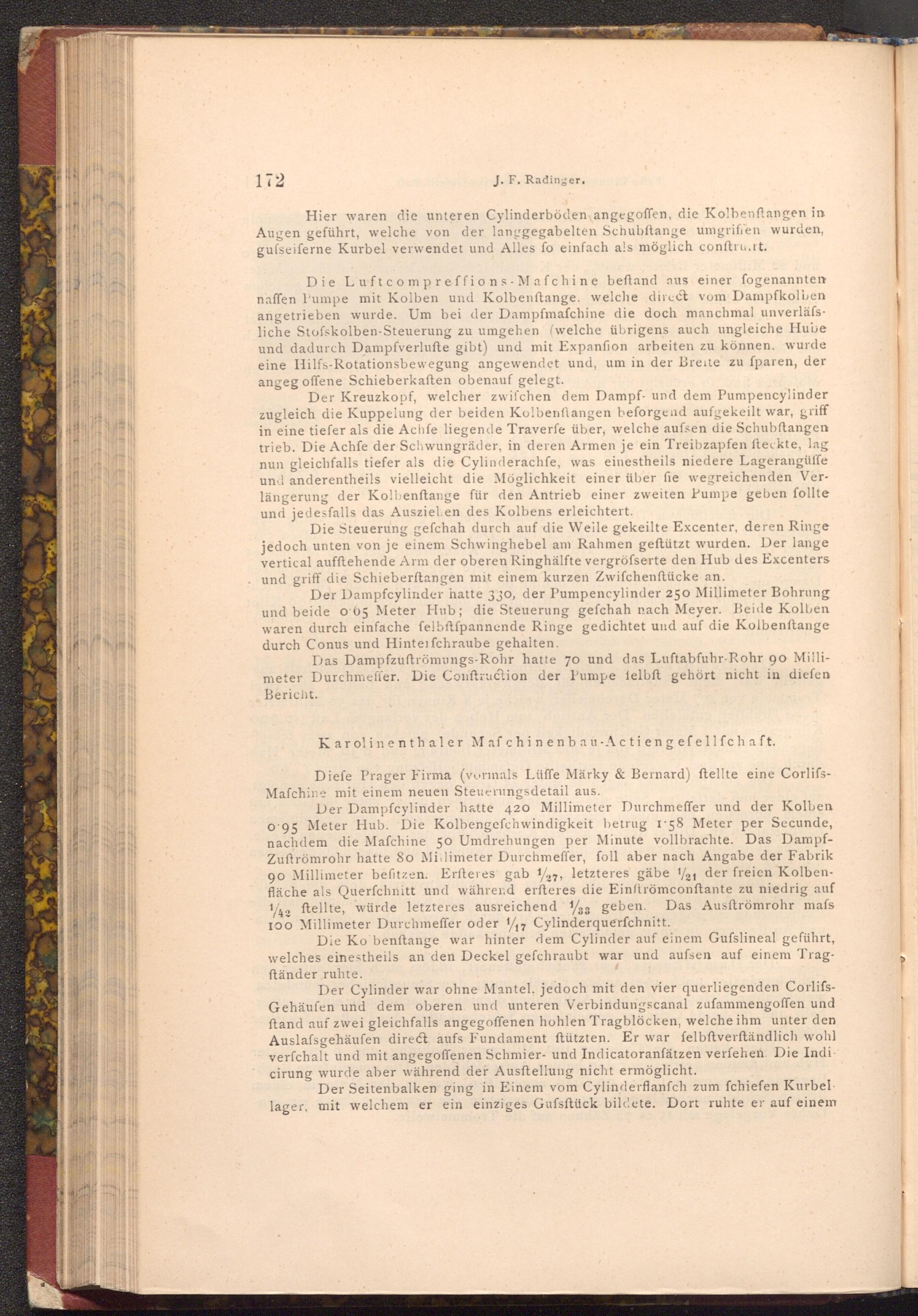 Der Dampfcylinder hatte 420 Millimeter Durchmeffer und der Kolben 0.95 Meter Hub. Die Kolbengefchwindigkeit betrug 158 Meter per Secunde, nachdem die Mafchine 50 Umdrehungen per Minute vollbrachte. Das DampfZuftrömrohr hatte 80 Millimeter Durchmeffer, foll aber nach Angabe der Fabrik 90 Millimeter befitzen. Erfteres gab 1/27, letzteres gäbe 21 der freien Kolbenfläche als Querfchnitt und während erfteres die Einftrömconftante zu niedrig auf Das Ausftrömrohr mafs 1/42 ftellte, würde letzteres ausreichend 1/3 geben.