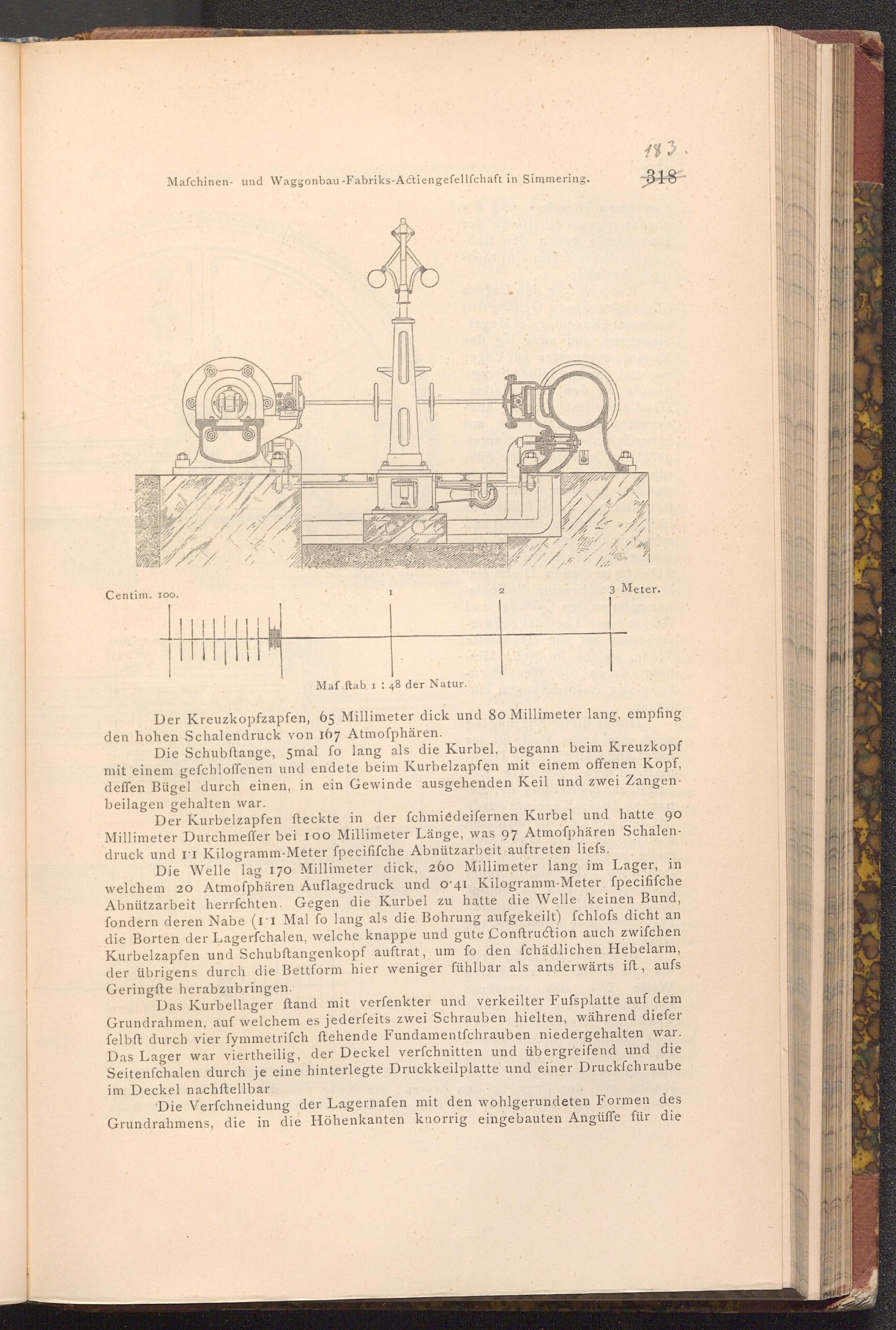 Der Kurbelzapfen fteckte in der fchmiedeifernen Kurbel und hatte 90 Millimeter Durchmeffer bei 100 Millimeter Länge, was 97 Atmoſphären Schalendruck und II Kilogramm- Meter ſpecififche Abnützarbeit auftreten liefs.