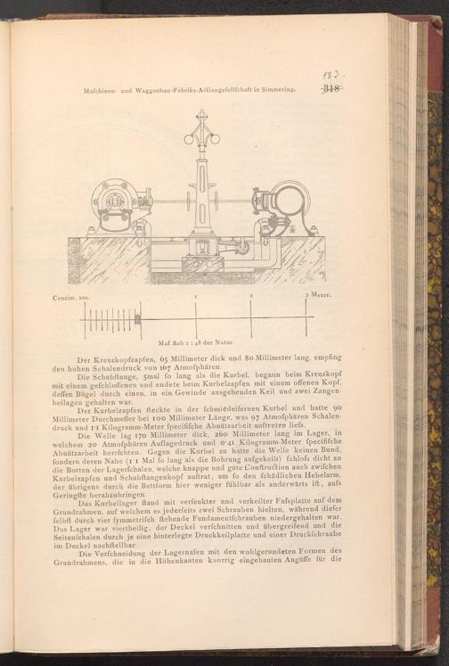Die Schubftange, 5mal fo lang als die Kurbel, begann beim Kreuzkopf mit einem gefchloffenen und endete beim Kurbelzapfen mit einem offenen Kopf, deffen Bügel durch einen, in ein Gewinde ausgehenden Keil und zwei Zangenbeilagen gehalten war.