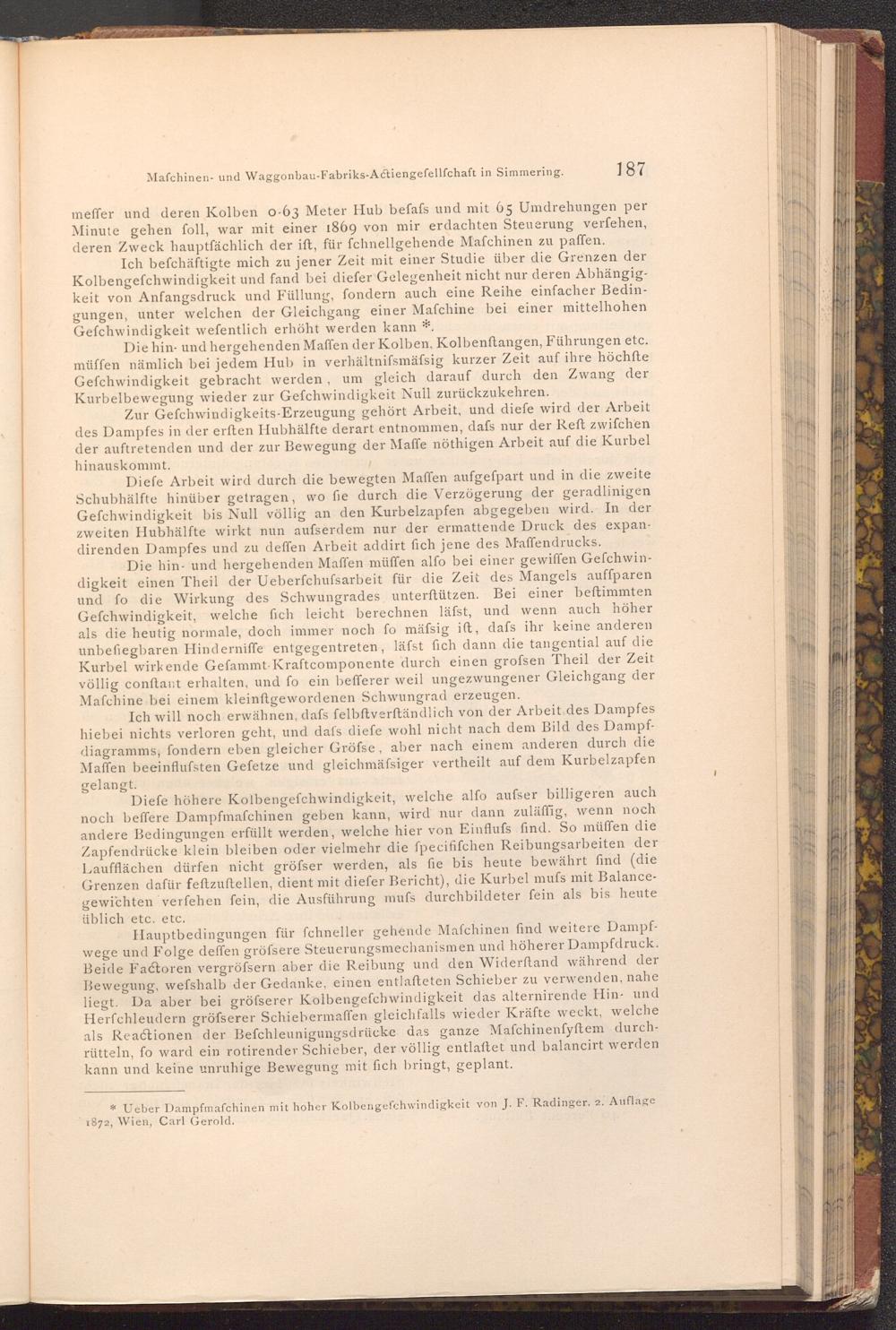 * Ueber Dampfmaschinen mit hoher Kolbengefchwindigkeit von J. F. Radinger. 2. Auflage 1872, Wien, Carl Gerold.