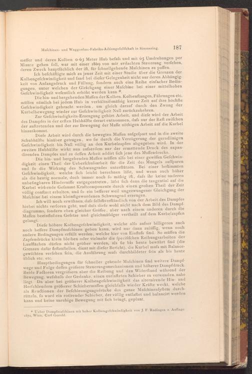 Ich befchäftigte mich zu jener Zeit mit einer Studie über die Grenzen der Kolbengefchwindigkeit und fand bei diefer Gelegenheit nicht nur deren Abhängigkeit von Anfangsdruck und Füllung, fondern auch eine Reihe einfacher Bedingungen, unter welchen der Gleichgang einer Maſchine bei einer mittelhohen Gefchwindigkeit wefentlich erhöht werden kann*.