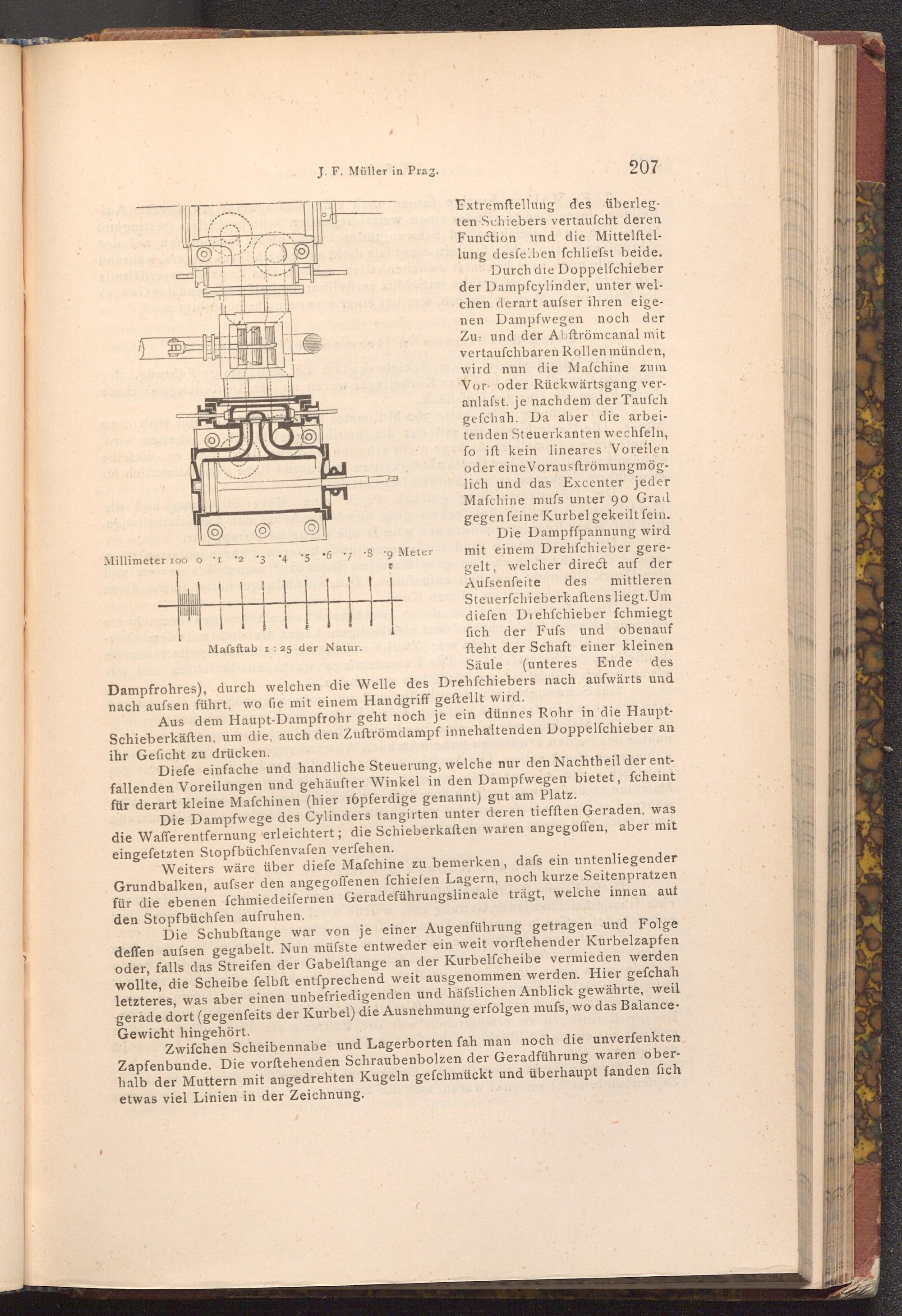 Weiters wäre über diefe Mafchine zu bemerken, dafs ein untenliegender Grundbalken, aufser den angegoffenen fchiefen Lagern, noch kurze Seitenpratzen für die ebenen fchmiedeifernen Geradeführungslineale trägt, welche innen auf den Stopfbüchfen aufruhen.