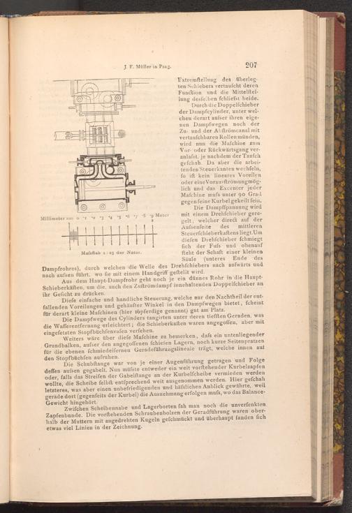 Die Dampffpannung wird mit einem Drehfchieber geregelt, welcher direct auf der Aufsenfeite des mittleren ☐ Steuerfchieberkaftens liegt. Um diefen Drehfchieber fchmiegt fich der Fufs und obenauf fteht der Schaft einer kleinen Säule( unteres Ende des