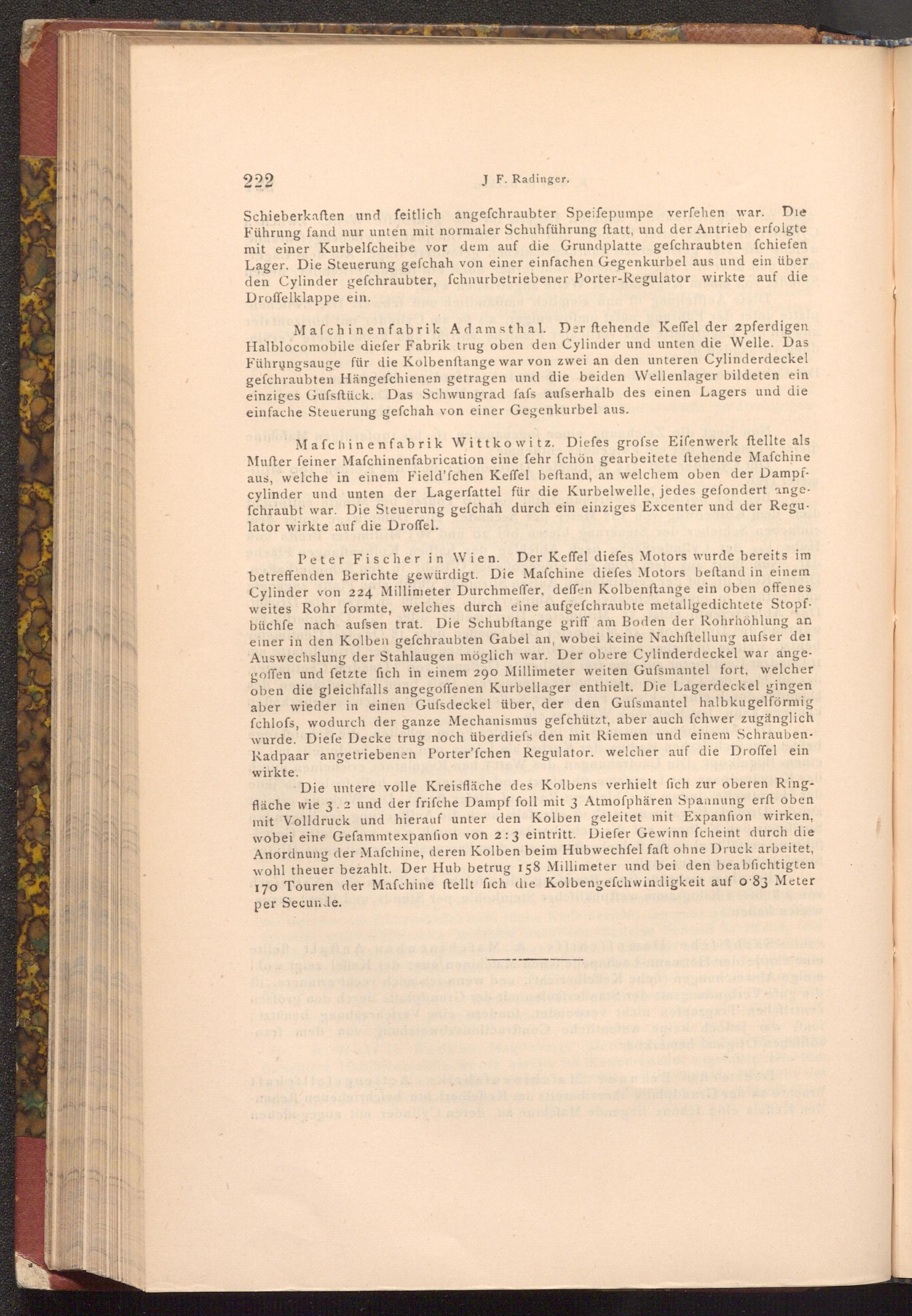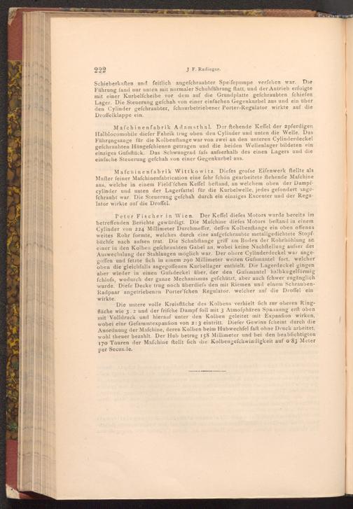Peter Fischer in Wien. Der Keffel diefes Motors wurde bereits im betreffenden Berichte gewürdigt. Die Mafchine diefes Motors beftand in einem Cylinder von 224 Millimeter Durchmeffer, deffen Kolbenstange ein oben offenes weites Rohr formte, welches durch eine aufgefchraubte metallgedichtete Stopfbüchfe nach aufsen trat. Die Schubftange griff am Boden der Rohrhöhlung an einer in den Kolben gefchraubten Gabel an, wobei keine Nachftellung aufser der Auswechslung der Stahlaugen möglich war. Der obere Cylinderdeckel war angegoffen und fetzte fich in einem 290 Millimeter weiten Gufsmantel fort, welcher oben die gleichfalls angegoffenen Kurbellager enthielt. Die Lagerdeckel gingen aber wieder in einen Gufsdeckel über, der den Gufsmantel halb kugelförmig fchlofs, wodurch der ganze Mechanismus gefchützt, aber auch fchwer zugänglich wurde. Diefe Decke trug noch überdiefs den mit Riemen und einem SchraubenRadpaar angetriebenen Porter'fchen Regulator. welcher auf die Droffel ein wirkte.