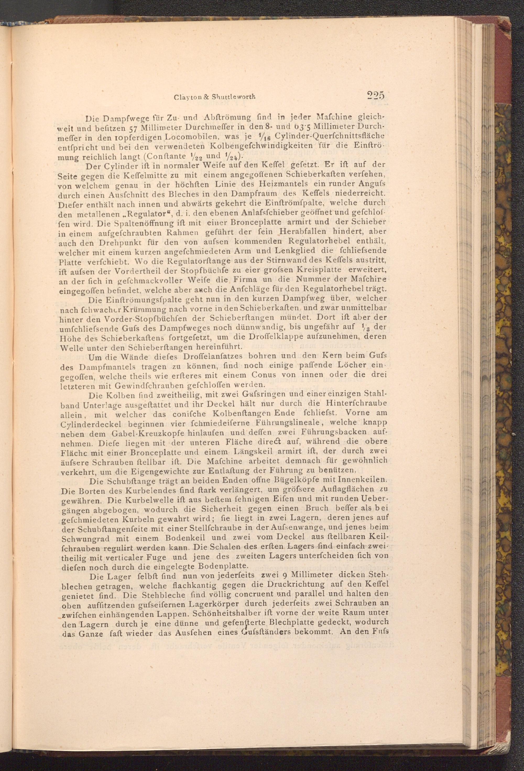 Der Cylinder ift in normaler Weife auf den Keffel gefetzt. Er ift auf der Seite gegen die Keffelmitte zu mit einem angegoffenen Schieberkaften verfehen, von welchem genau in der höchften Linie des Heizmantels ein runder Angufs durch einen Ausfchnitt des Bleches in den Dampfraum des Keffels niederreicht. Diefer enthält nach innen und abwärts gekehrt die Einftrömfpalte, welche durch den metallenen, Regulator", d. i. den ebenen Anlafsfchieber geöffnet und gefchloffen wird. Die Spaltenöffnung ift mit einer Bronceplatte armirt und der Schieber in einem aufgefchraubten Rahmen geführt der fein Herabfallen hindert, aber auch den Drehpunkt für den von aufsen kommenden Regulatorhebel enthält, welcher mit einem kurzen angefchmiedeten Arm und Lenkglied die fchliefsende Platte verfchiebt. Wo die Regulatorftange aus der Stirnwand des Keffels austritt, ift aufsen der Vordertheil der Stopfbüchfe zu eier grofsen Kreisplatte erweitert, an der fich in gefchmackvoller Weife die Firma un die Nummer der Mafchire eingegoffen befindet, welche aber auch die Anfchläge für den Regulatorhebel trägt.