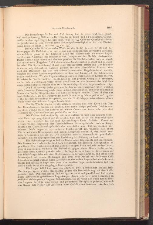 Die Dampfwege für Zu- und Abftrömung find in jeder Mafchine gleichweit und befitzen 57 Millimeter Durchmeffer in den 8. und 63.5 Millimeter Durchmeffer in den 10pferdigen Locomobilen, was je 1/16 Cylinder- Querfchnittsfläche entspricht und bei den verwendeten Kolbengefchwindigkeiten für die Einftrö mung reichlich langt( Conftante 22 und 1/24).
