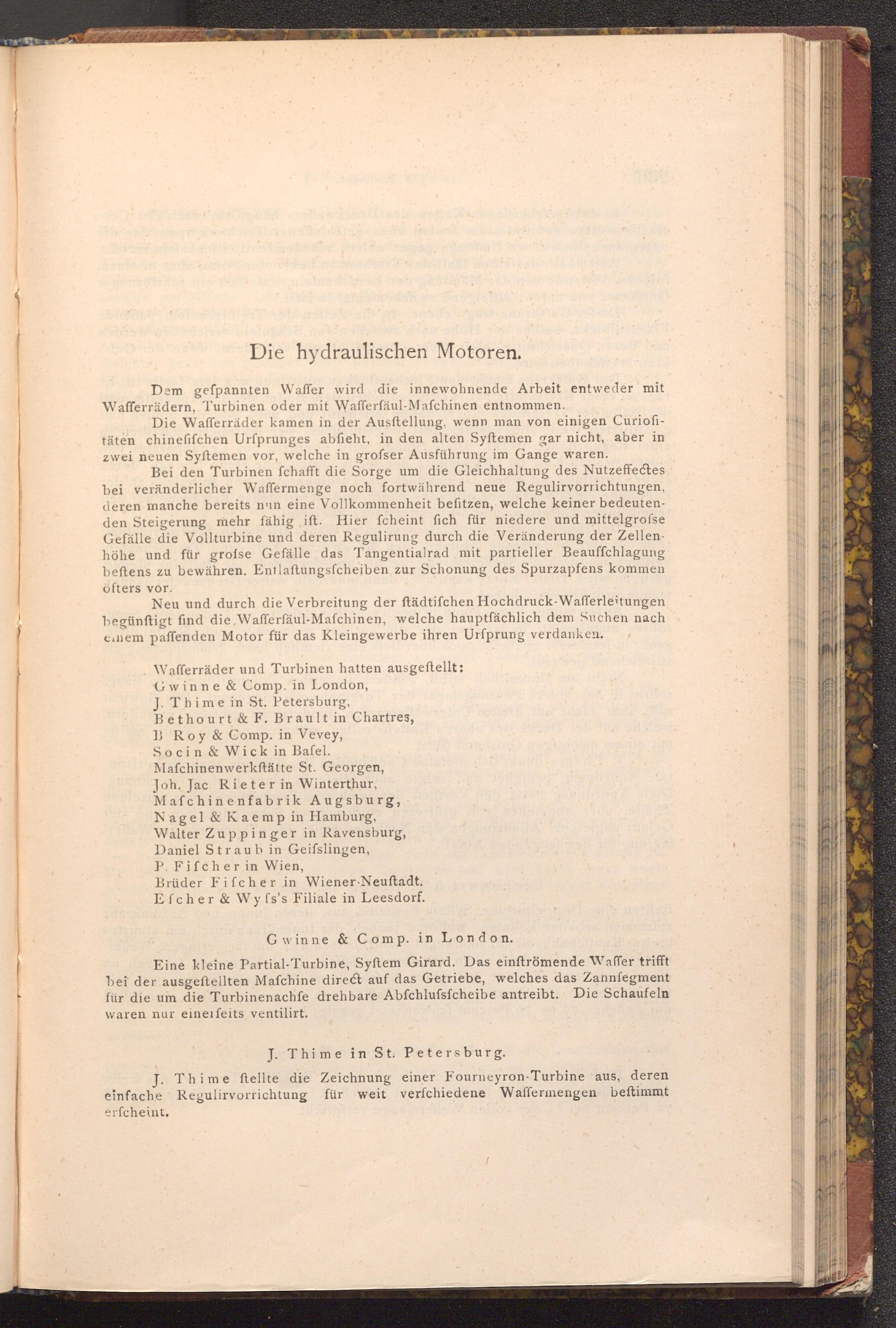Die Wafferräder kamen in der Ausftellung, wenn man von einigen Curiofitäten chinefifchen Urfprunges abfieht, in den alten Syftemen gar nicht, aber in zwei neuen Syftemen vor, welche in grofser Ausführung im Gange waren.