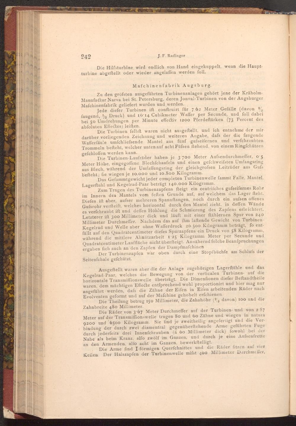 Ausgeftellt waren aber die der Anlage zugehörigen Lagerftühle und das Kegelrad Paar, welches die Bewegung von der verticalen Turbinen- auf die horizontale Transmiffionswelle überträgt. Die Dimenfionen diefer Beftandtheile waren, dem mächtigen Effecte entſprechend wohl proportionirt und hier mag nur angeführt werden, dafs die Zähne der Eifen in Eifen arbeitenden Räder nach Evolventen geformt und auf der Mafchine gehobelt erfchienen.